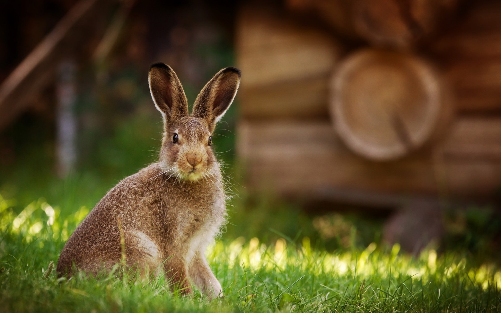 Description: A rabbit sitting in the grass near a log cabin and a log house in the background with a light shining on it.