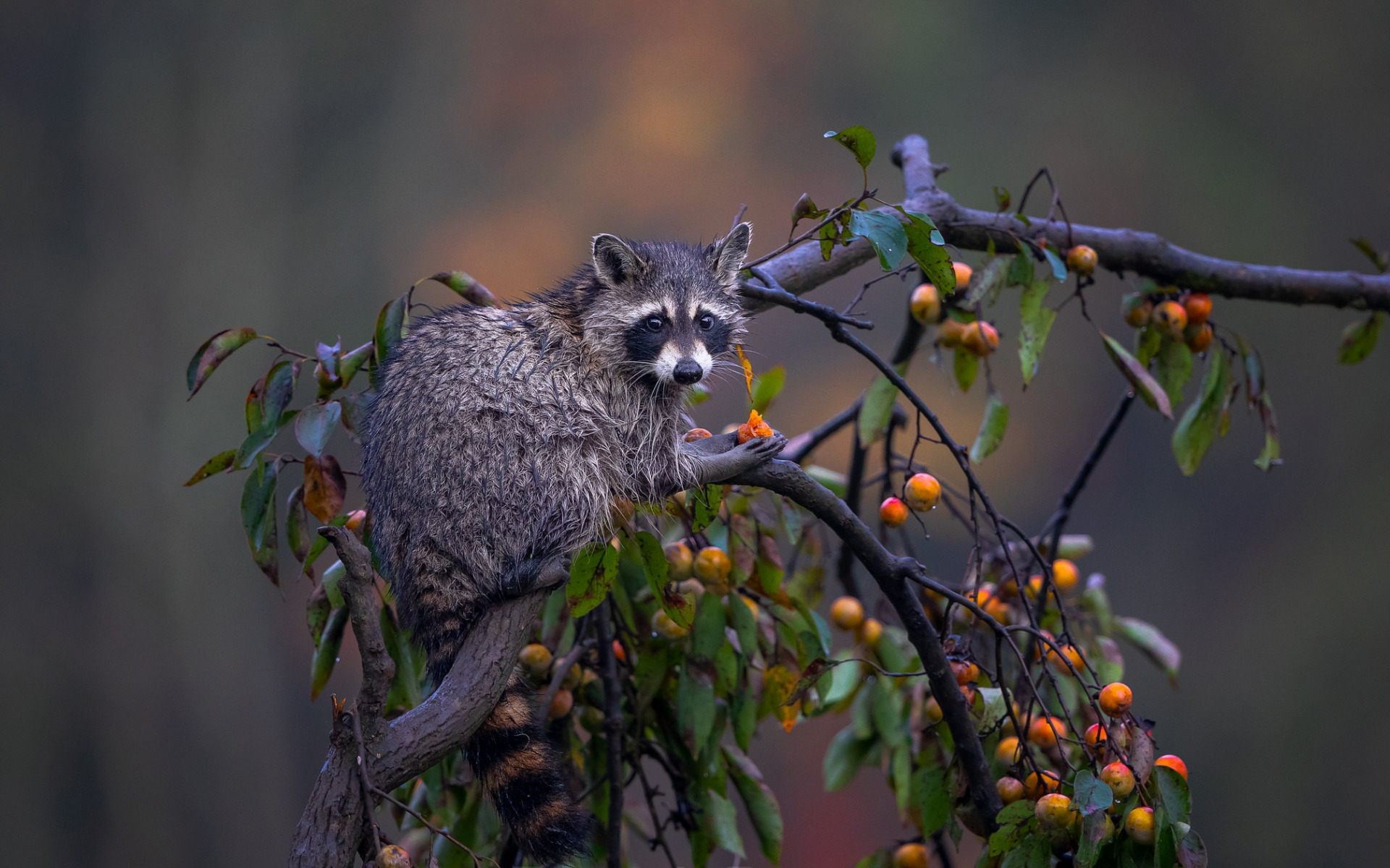 Description: A raccoon is sitting on a branch eating berries from a tree branch with leaves and berries on it.