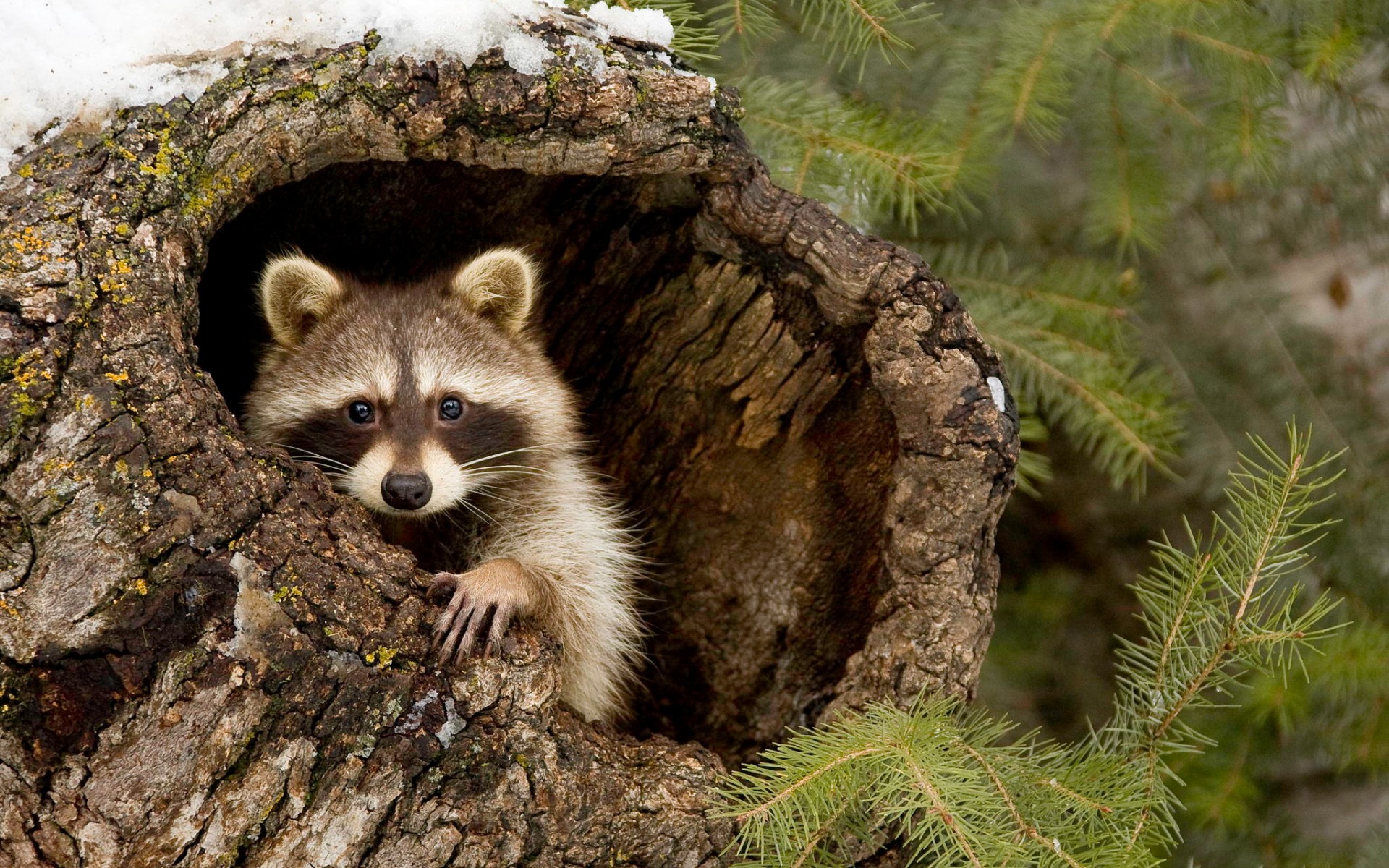 Description: A raccoon peeks out of a hollow in a tree trunk in a forest filled with snow.