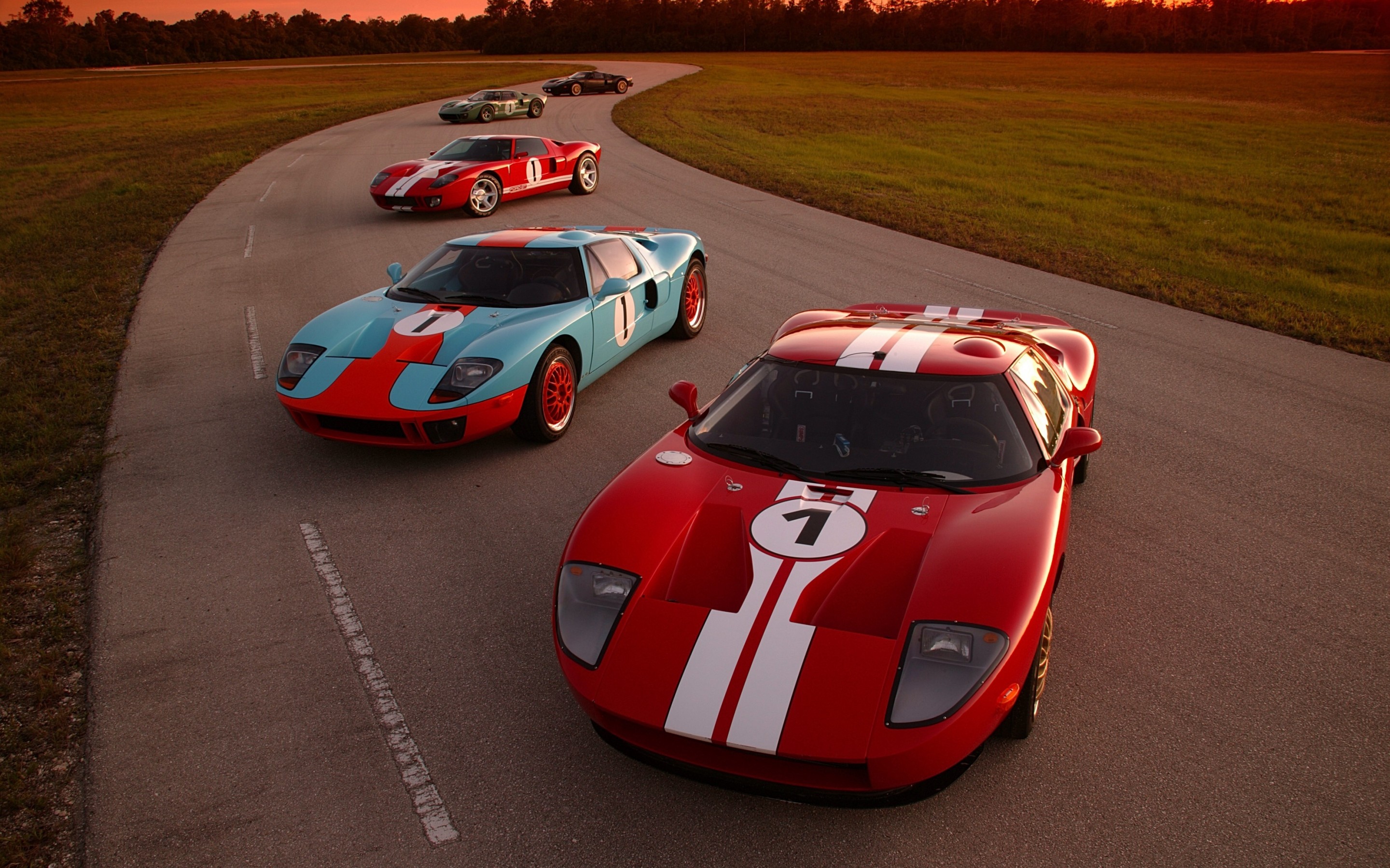 Description: A group of three race cars driving down a road at sunset or dawn with the sun setting behind them.