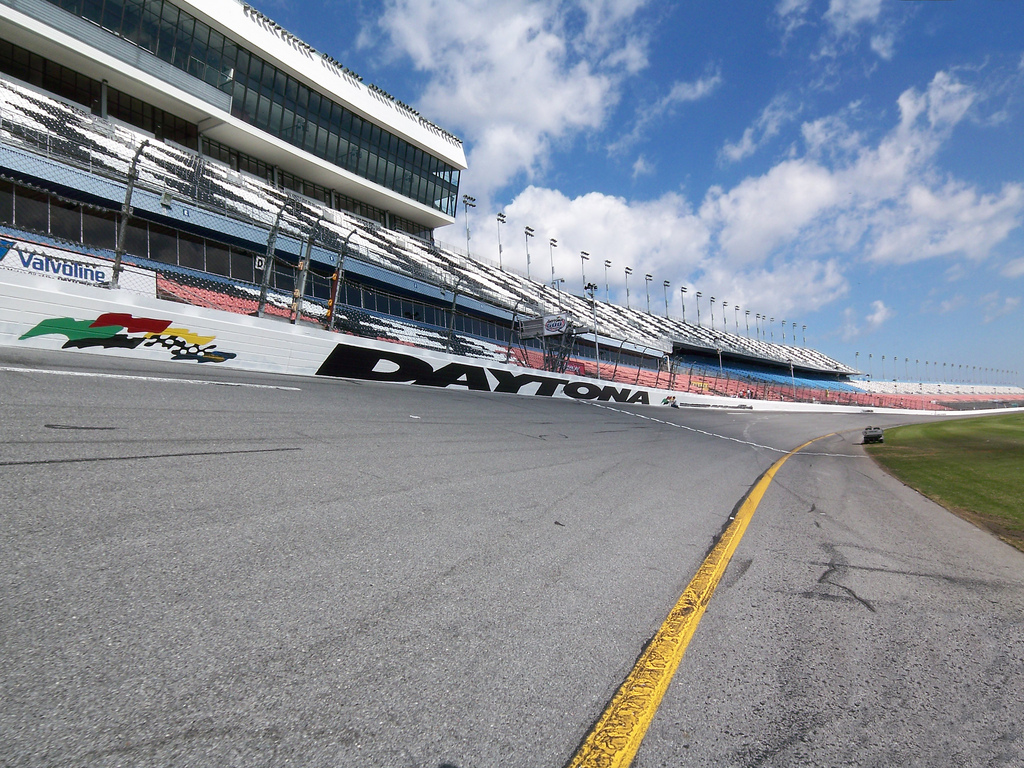 Description: A race track with a racing car on it and a sky background with clouds in the background and a yellow line on the side of the track.
