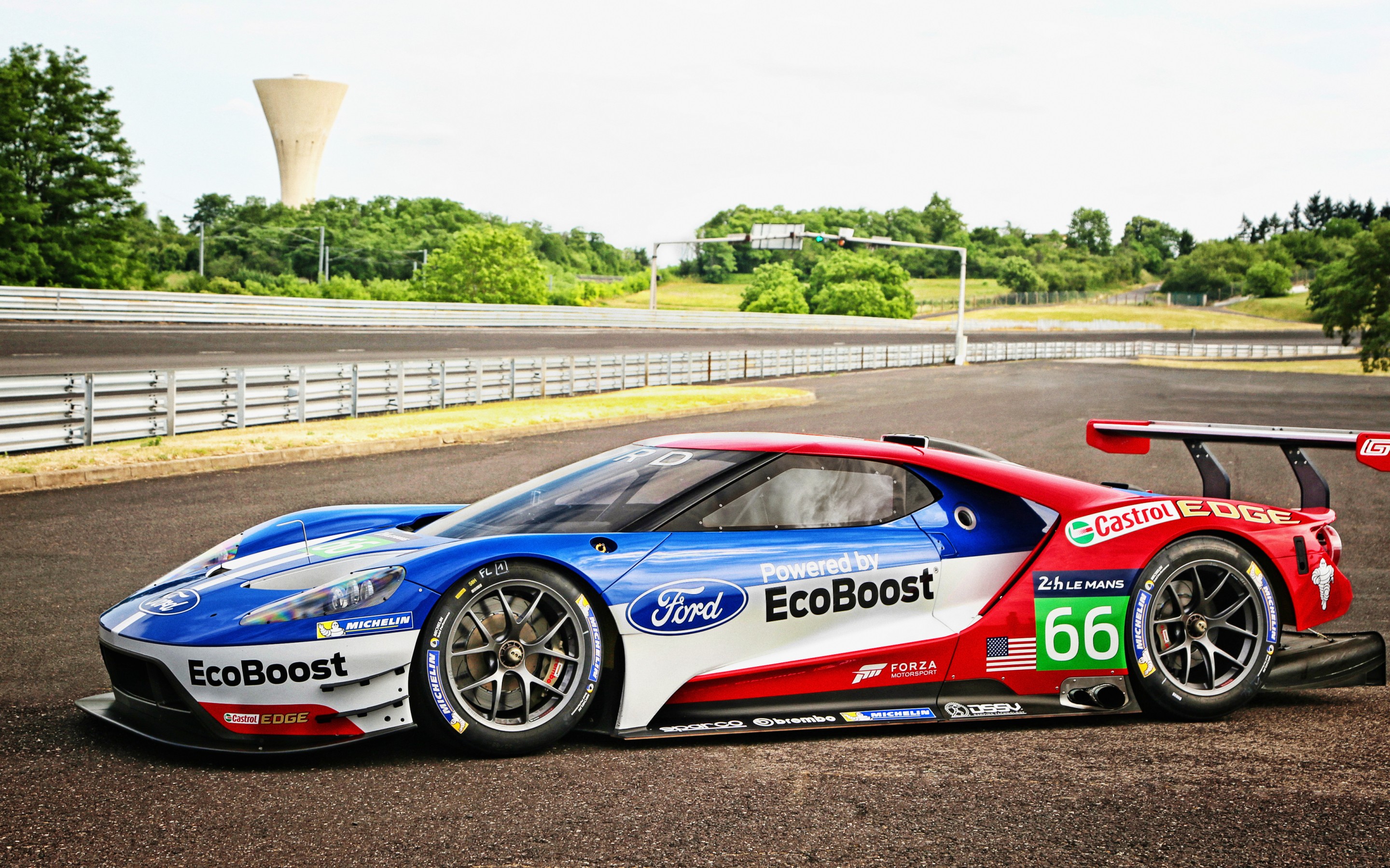 Description: A red and blue race car on a race track with a water tower in the background and a sky background.