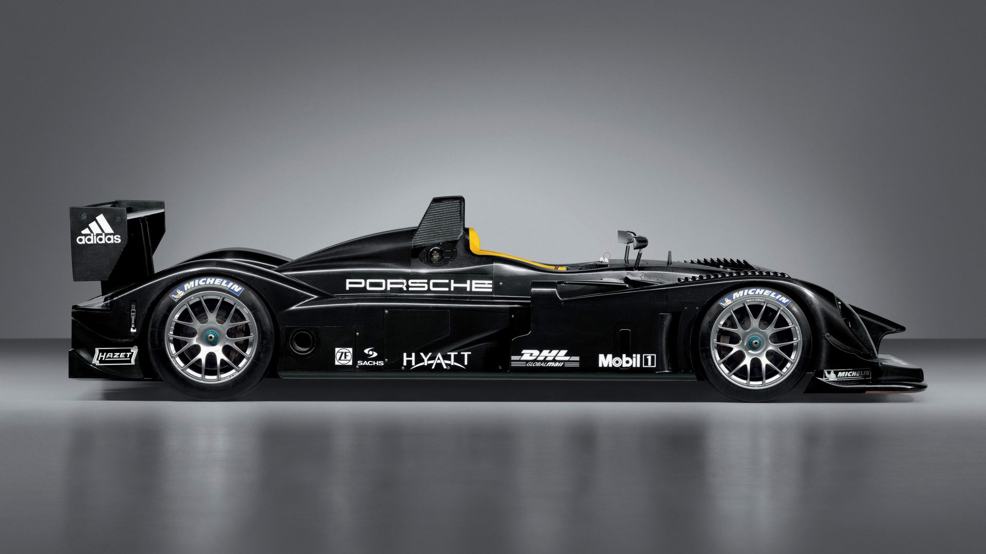 Description: A black race car with a yellow stripe on it's side and a black and white background with a yellow stripe.