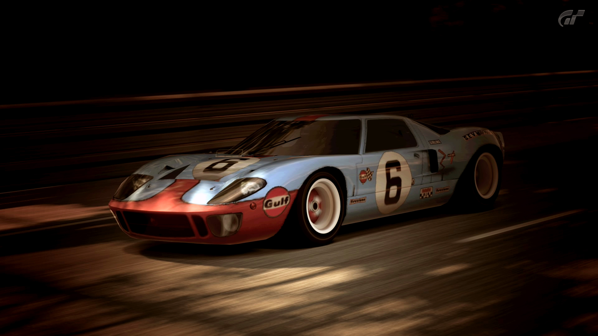 Description: A racing car speeding down a track at night time with lights on it's side and number six on the front.