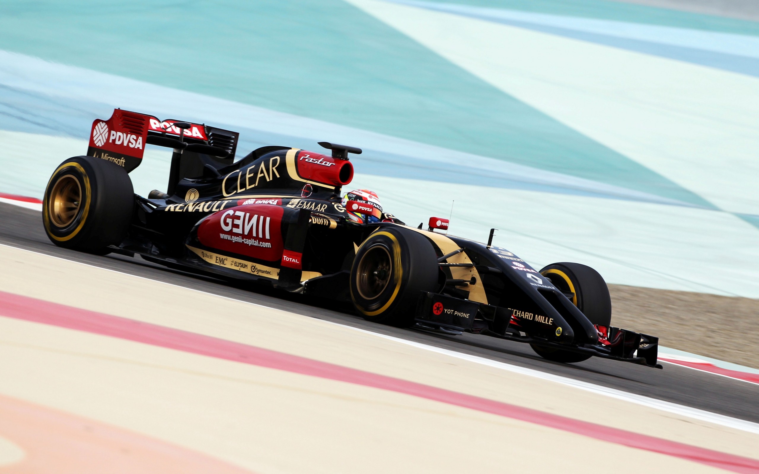 Description: A racing car driving down a race track with a person on it's side of the track and a person on the back of the car.