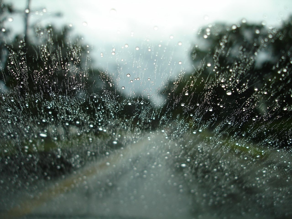 Description: A rain covered windshield with trees in the background and a street sign in the foreground with a sky background.