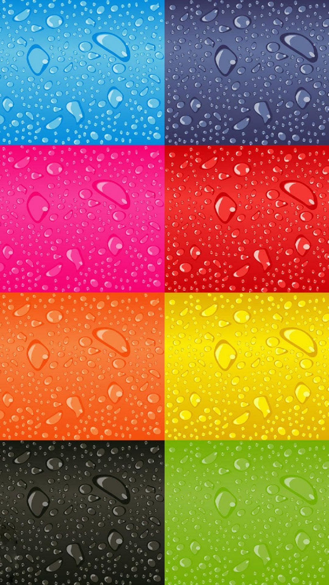 Description: A set of four different color variations of rain drops on a window glass with a black background and a red.