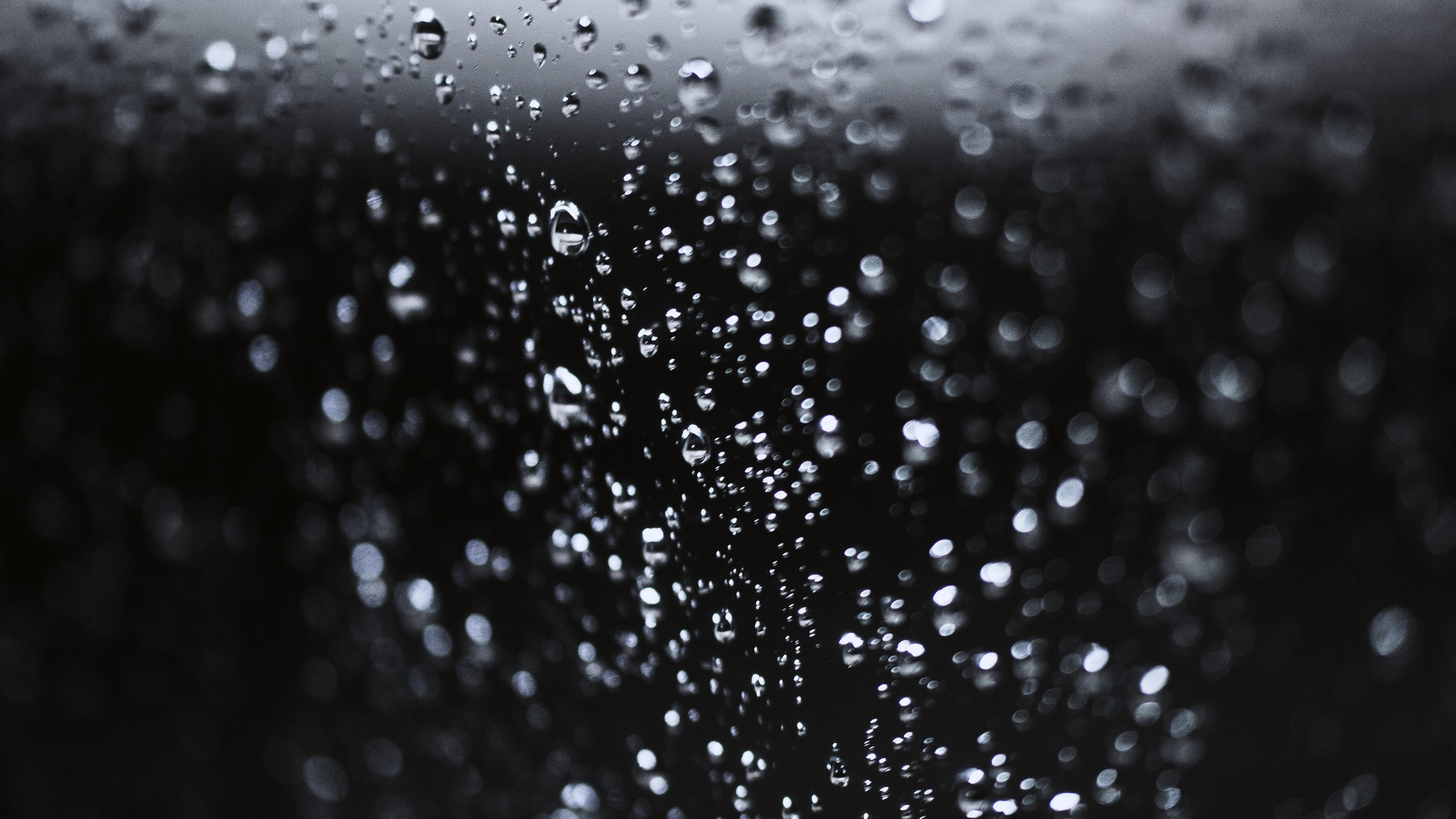Description: A black and white photo of rain drops on a window glass with a black background and a white background.