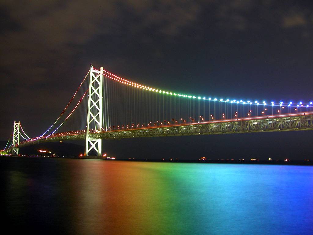 Description: A rainbow colored bridge over a body of water at night with a rainbow colored bridge in the background and a dark sky.