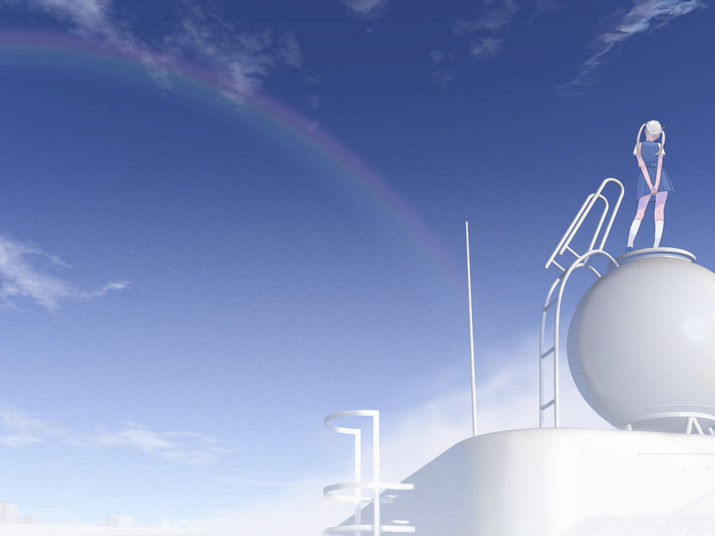 Description: A rainbow is in the sky over a building with a weather vane and a weather vane on top of it.