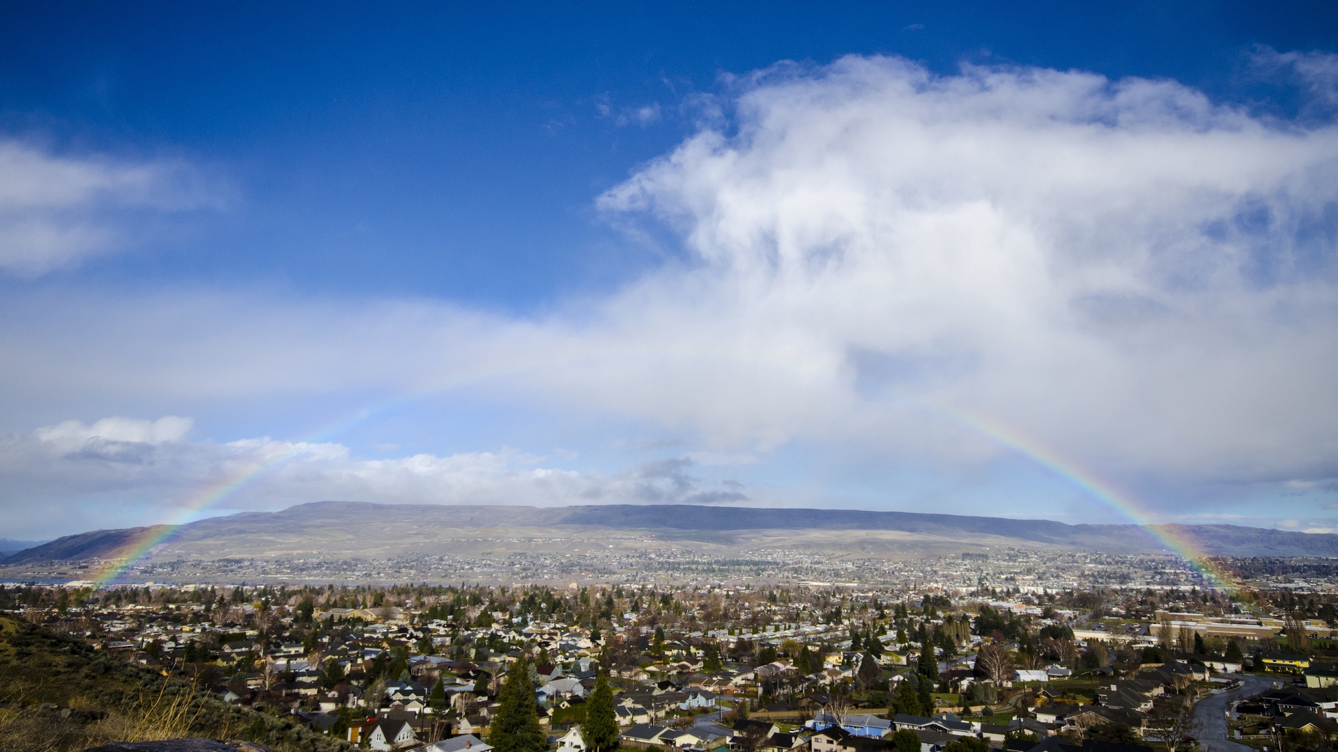 Description: A rainbow is seen over a city with mountains in the background and a blue sky with clouds in the foreground.