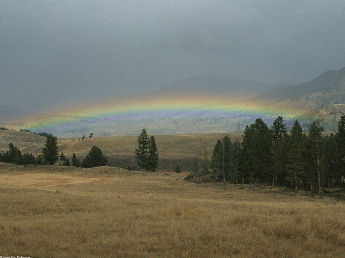 Description: A rainbow is seen in the distance over a field of grass and trees in the foreground.