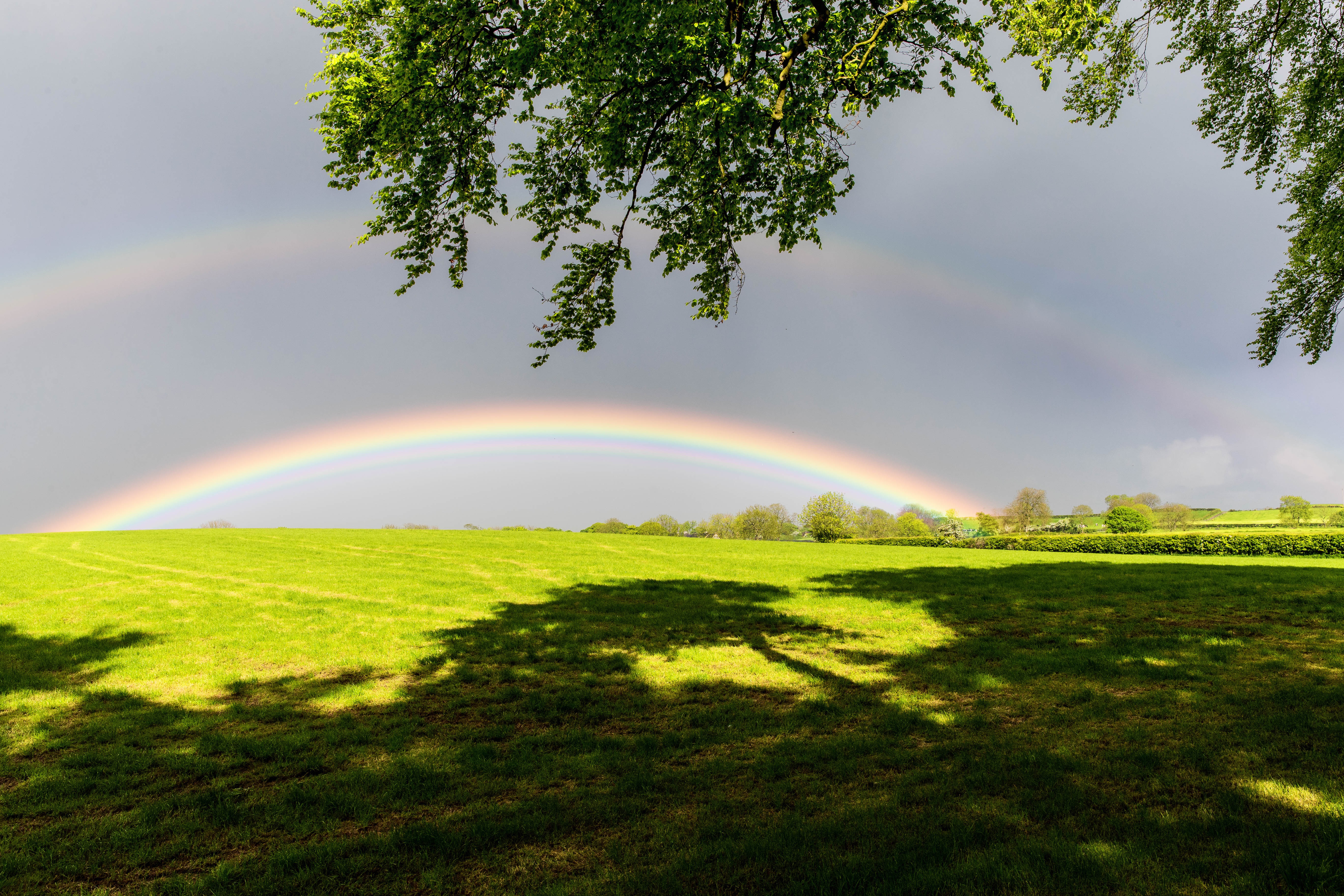 Description: A rainbow appears over a green field with trees and grass in the foreground and a dark sky in the background.