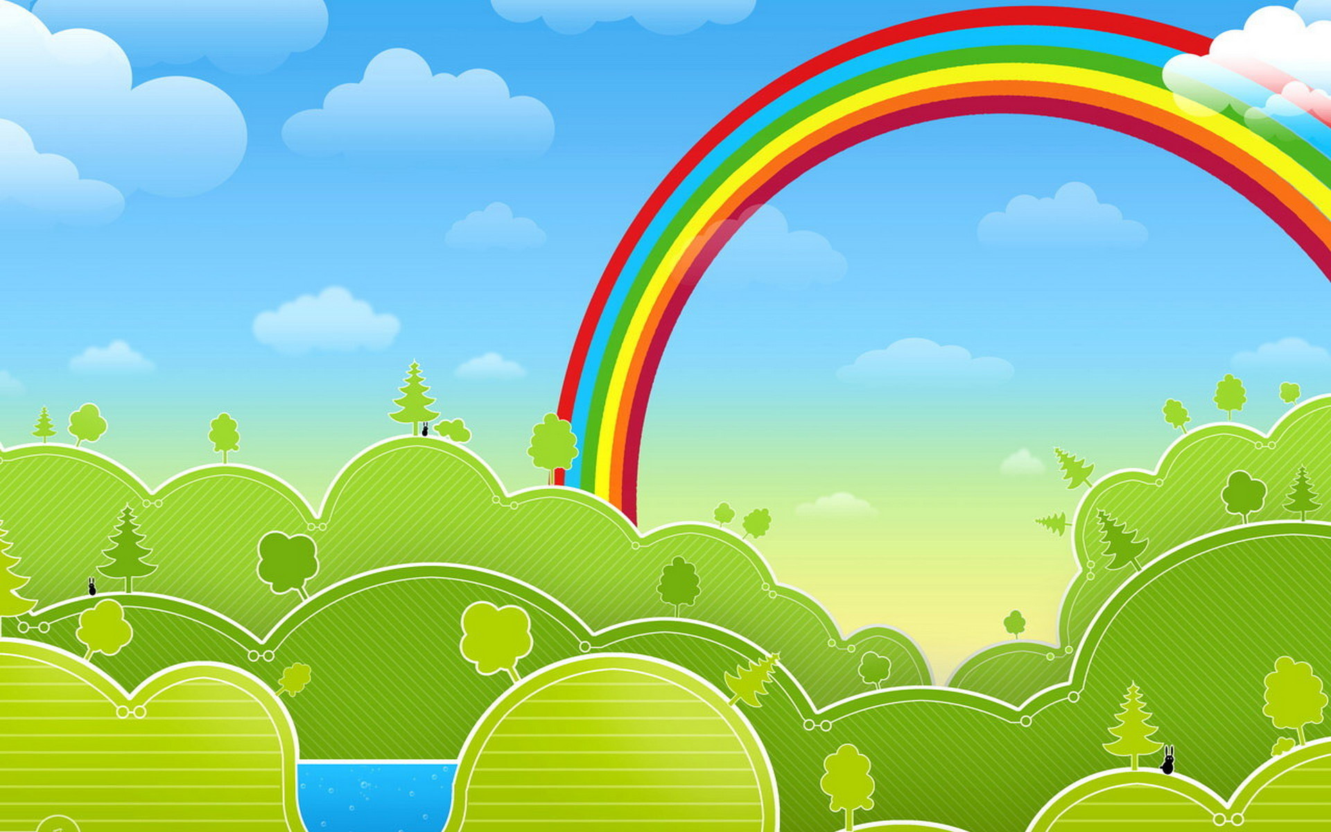 Description: A rainbow in the sky over a green landscape with trees and a stream of water in the foreground.