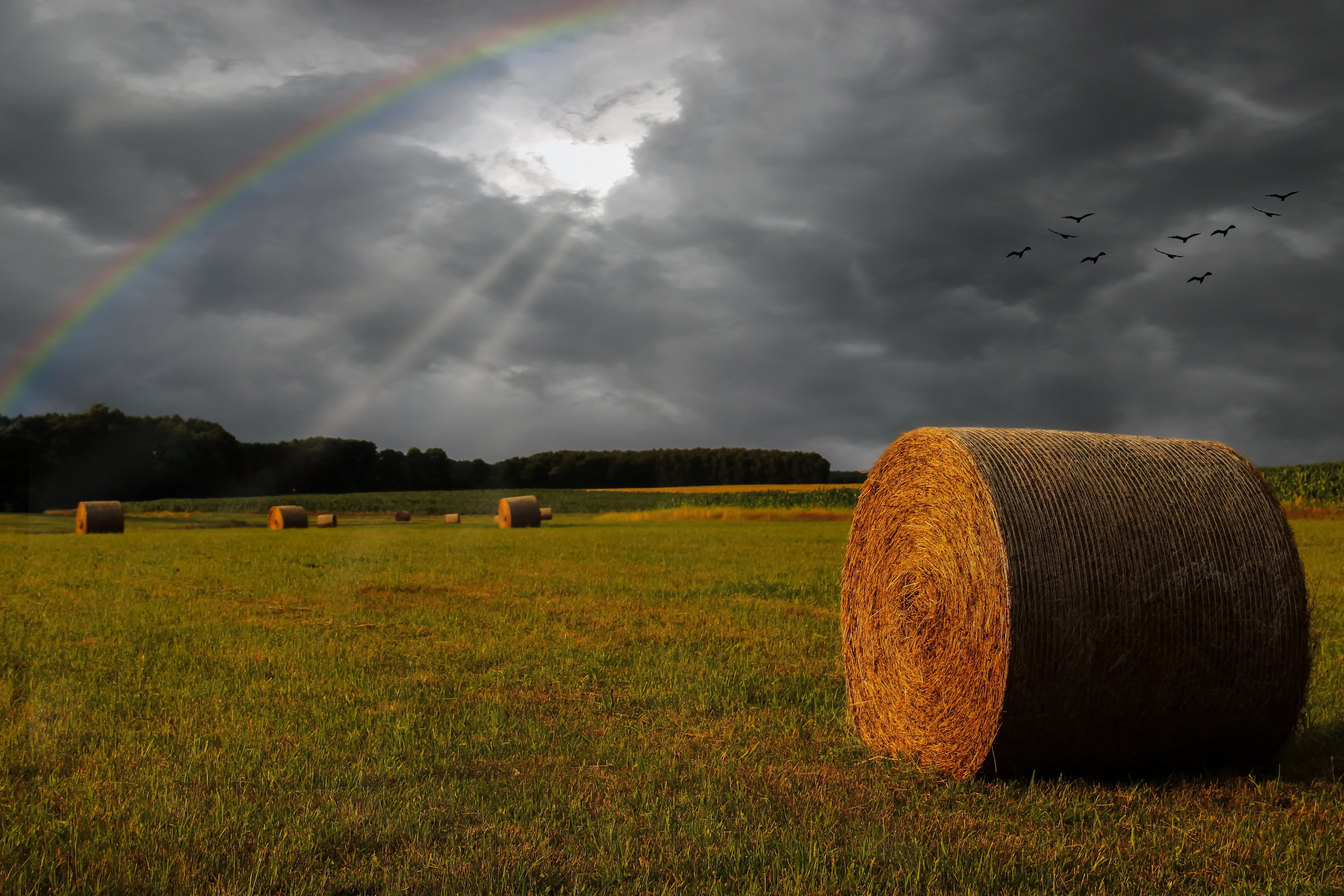 Description: A rainbow is seen in the sky over a field of hay bales and birds flying by in the distance.