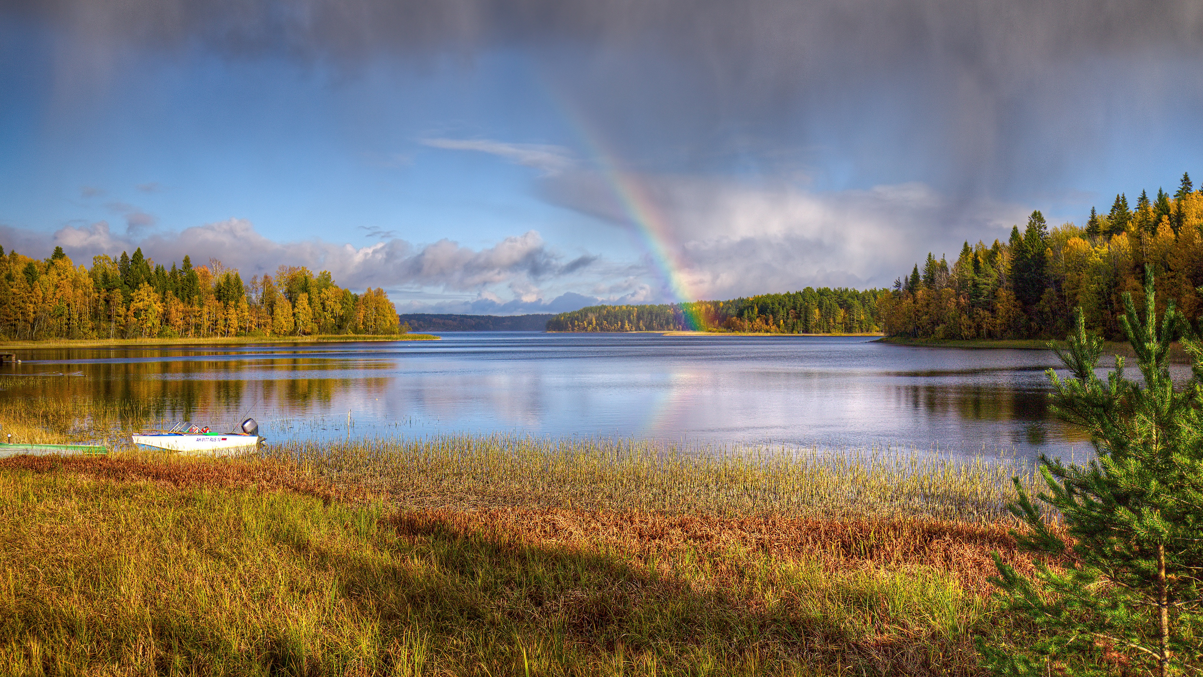 Description: A rainbow is seen over a lake with a boat in the foreground and a forest in the background.