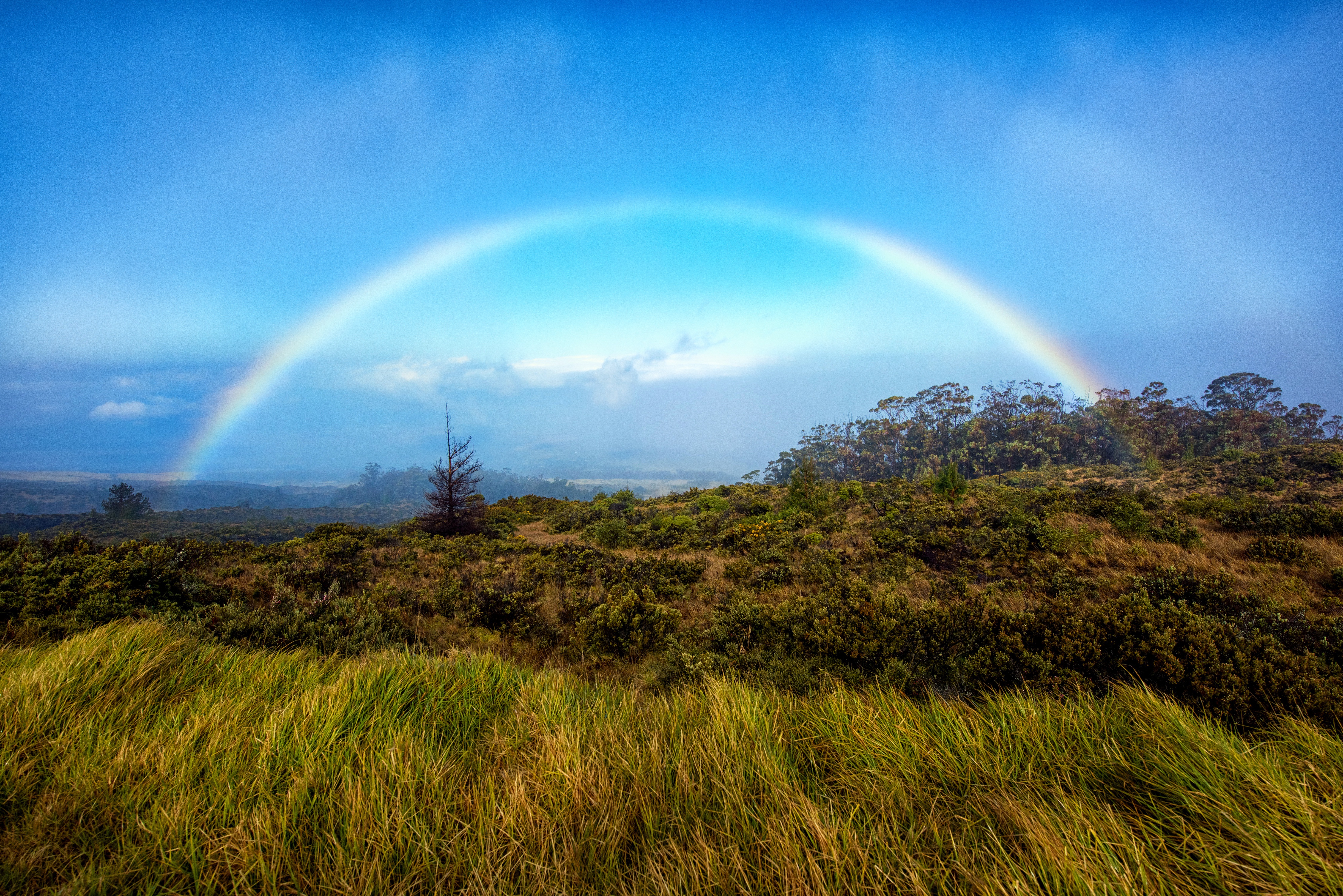 Description: A rainbow appears over a grassy hill with trees and bushes on the side of it.