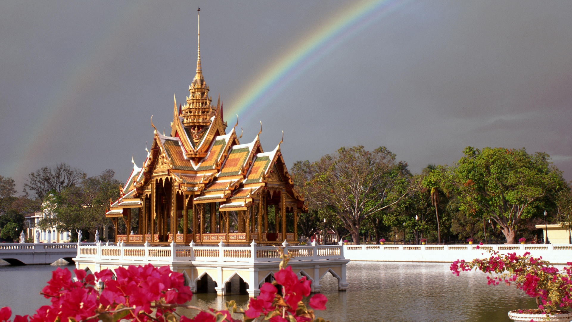 Description: A rainbow is in the sky over a building with a bridge and flowers in front of it and a bridge across the water.