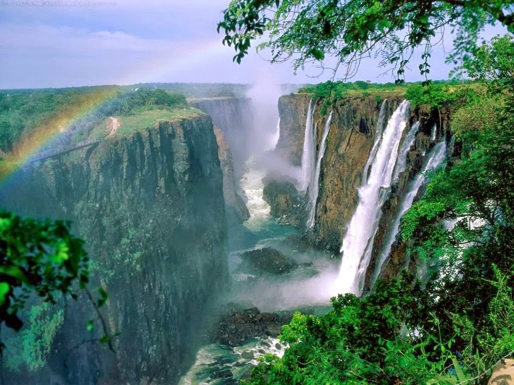 Description: A rainbow is seen over a waterfall in the jungles of africa.