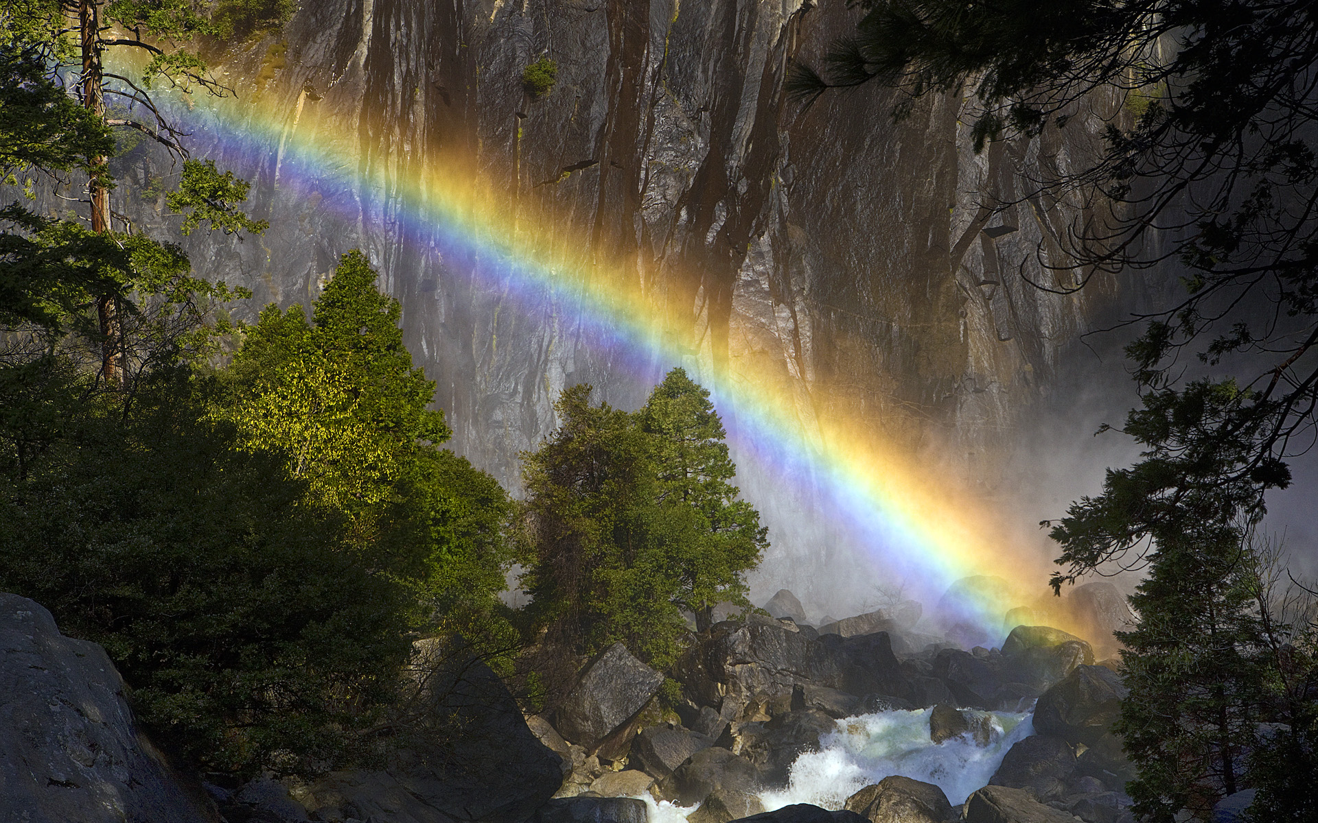 Description: A rainbow is shining in the sky over a waterfall and a river with rapids and trees in the foreground.