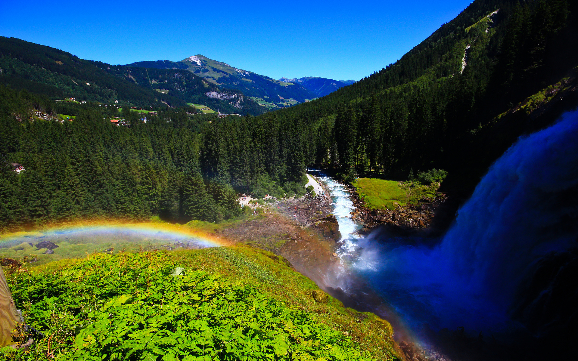 Description: A rainbow is seen in the distance over a waterfall and a river in the foreground with mountains in the background.