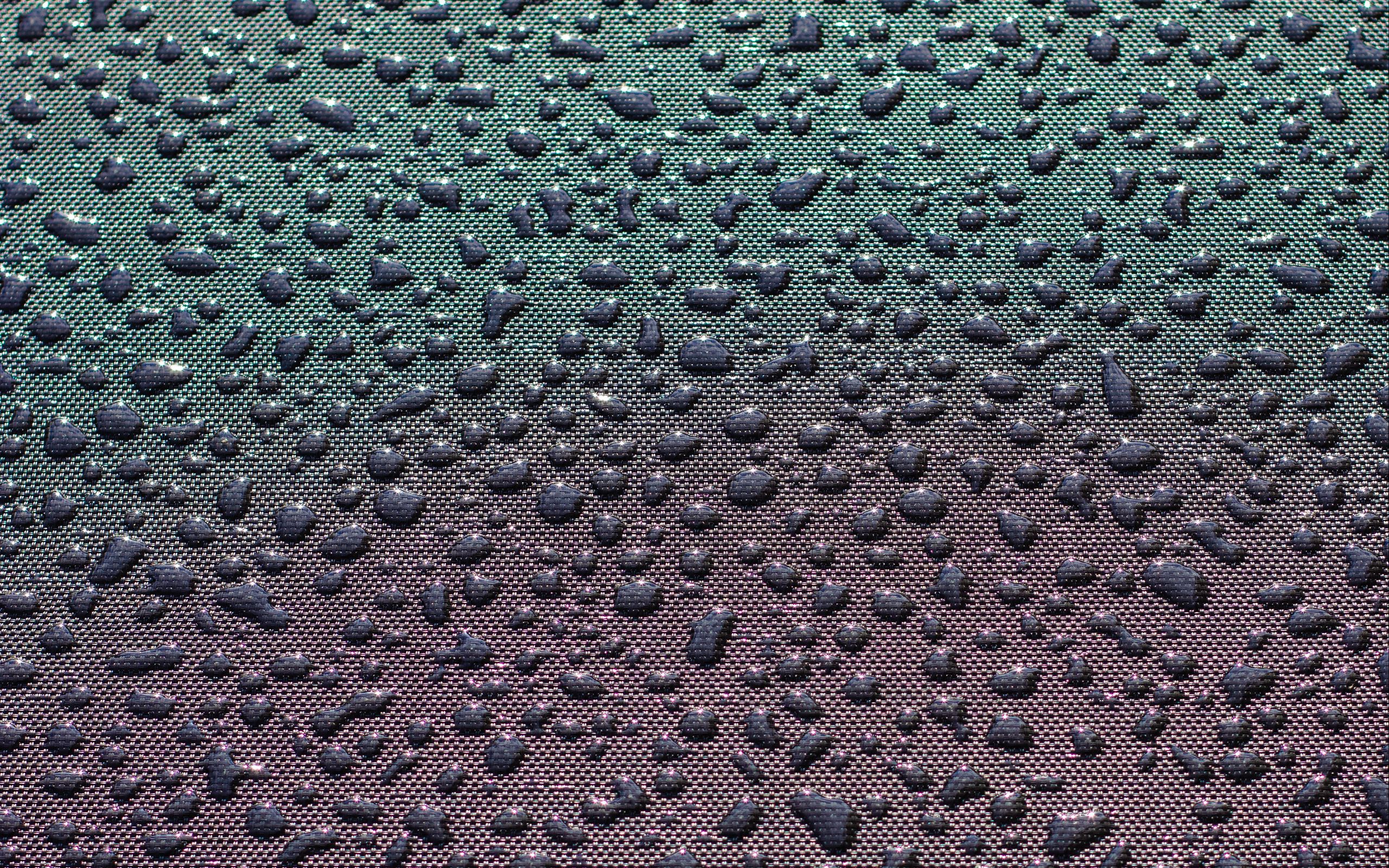 Description: A close up of a raindrop on a window with a green and purple background and a black and white stripe.