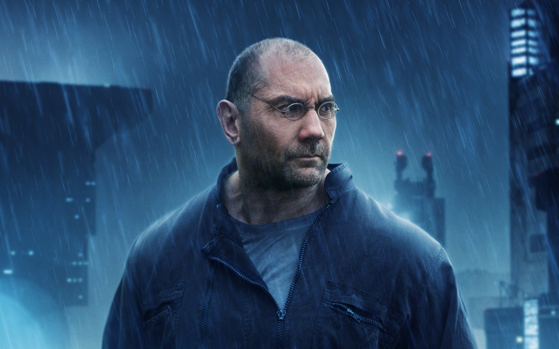 Description: A man in a blue jacket and glasses standing in the rain in a city at night with a skyscraper in the background.