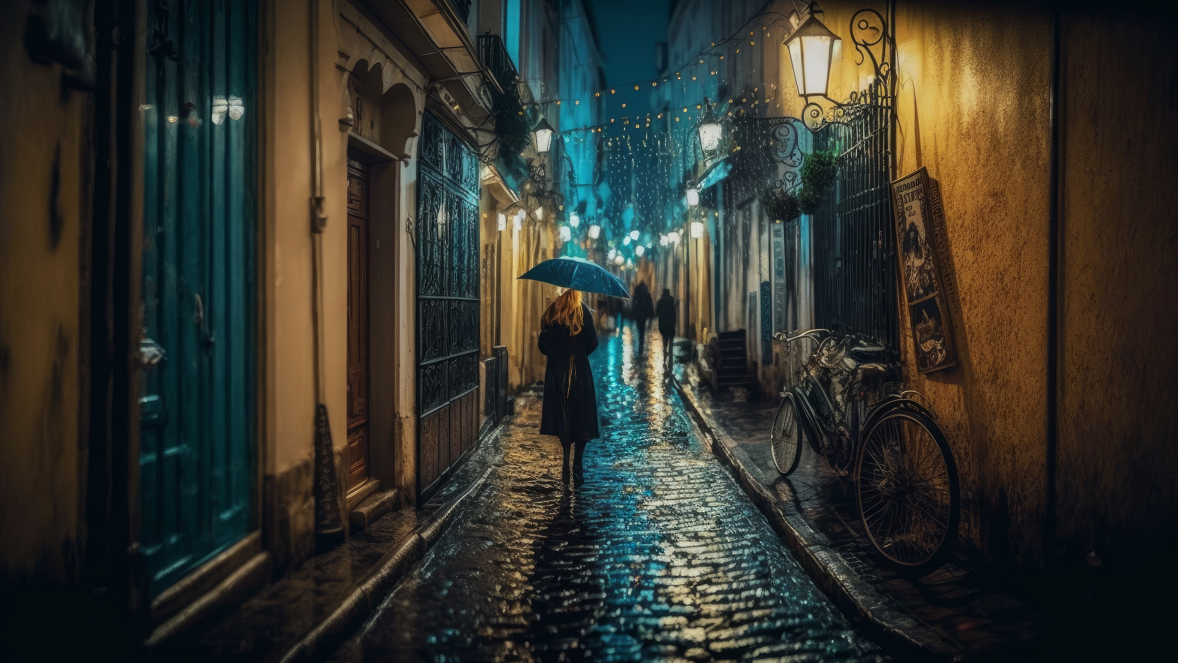 Description: A couple of people walking down a street holding an umbrella in the rain at night time with lights on.