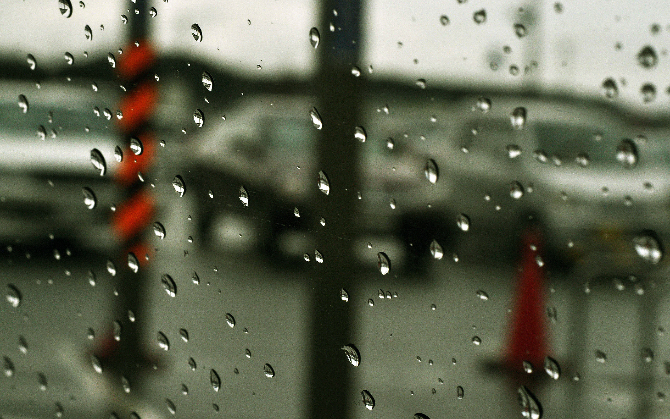Description: A view of a street through a rain covered window with a red traffic light in the background and a blurry car in the background.