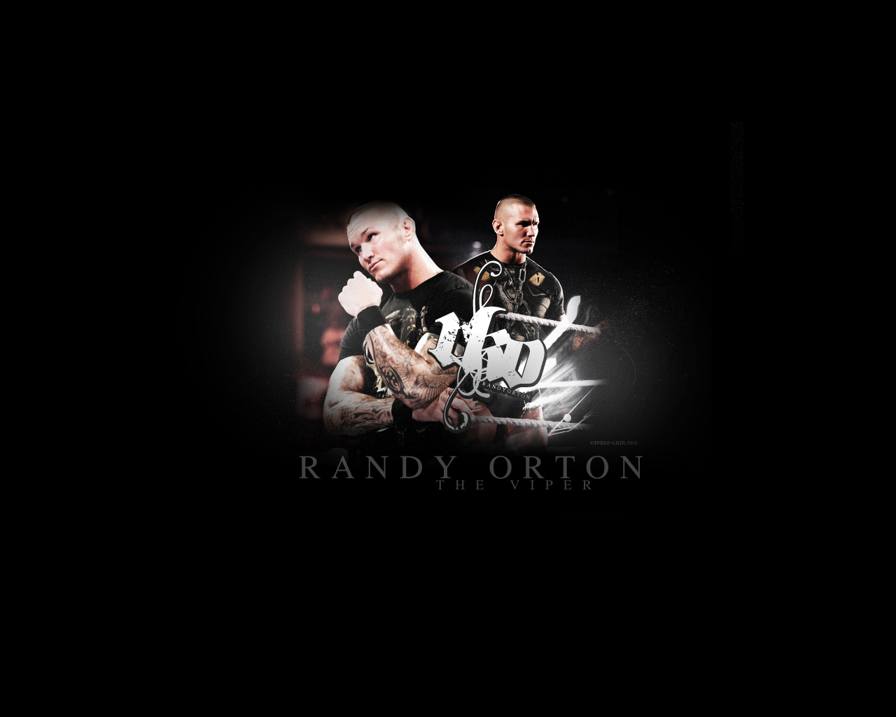 Description: Randy orton and the virtor logo on a black background with a man in a black shirt.