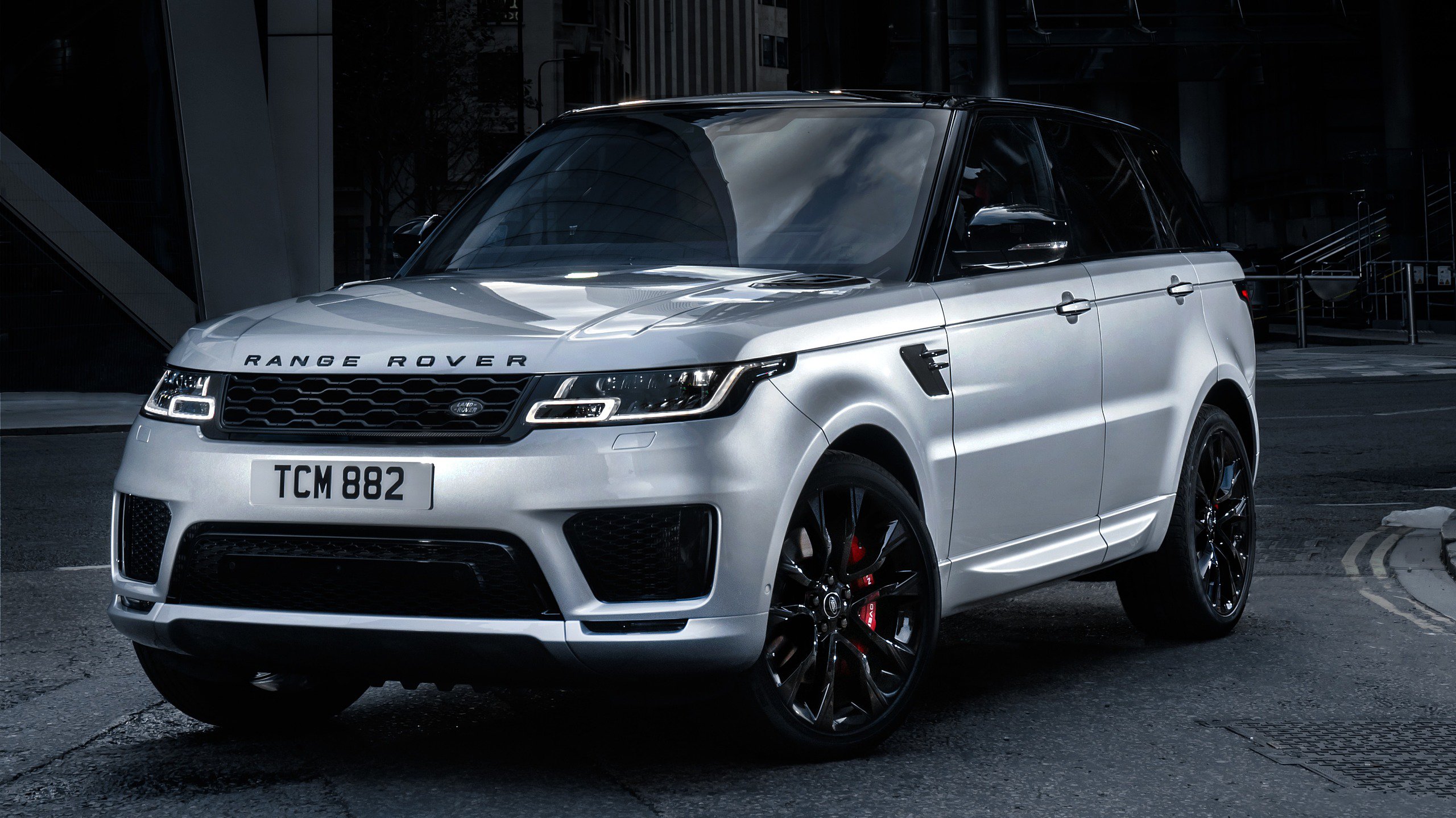 Description: A range rover parked on a city street at night time with its hood up and lights on.