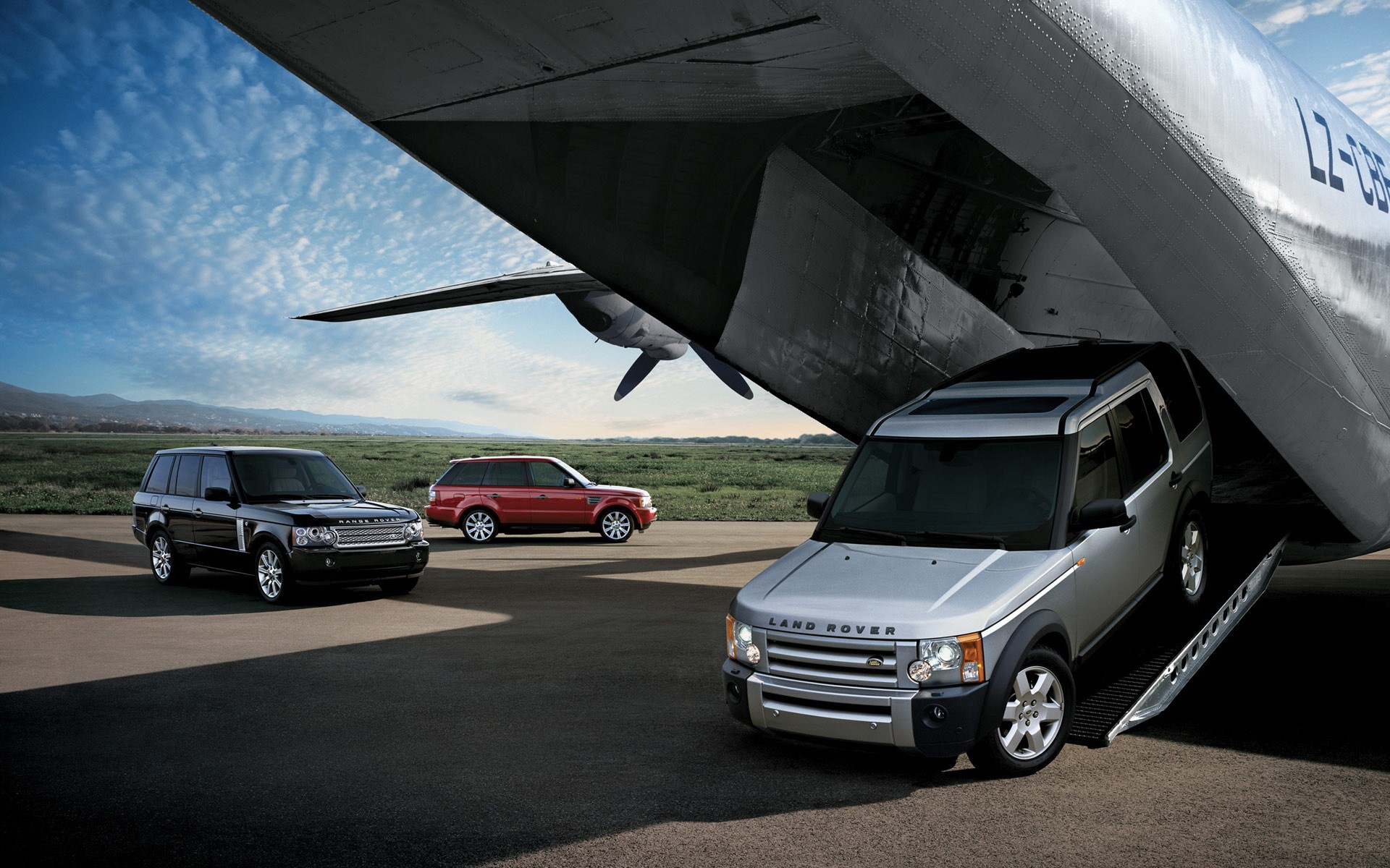 Description: A range rover and a jeep parked in front of a plane on a runway with a plane in the background.