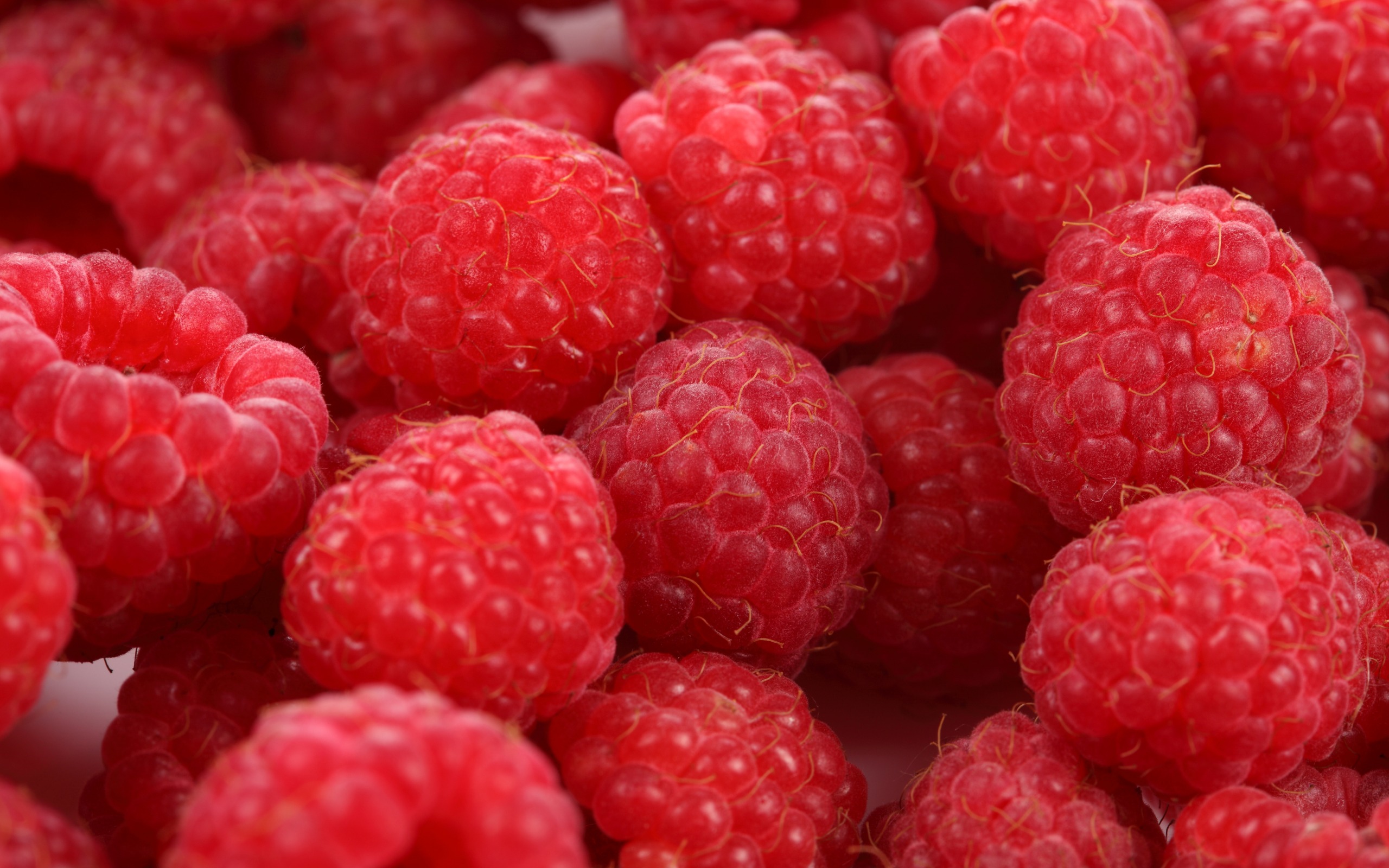 Description: A pile of raspberries with one ripe and one unpeeled one on the top of the pile.