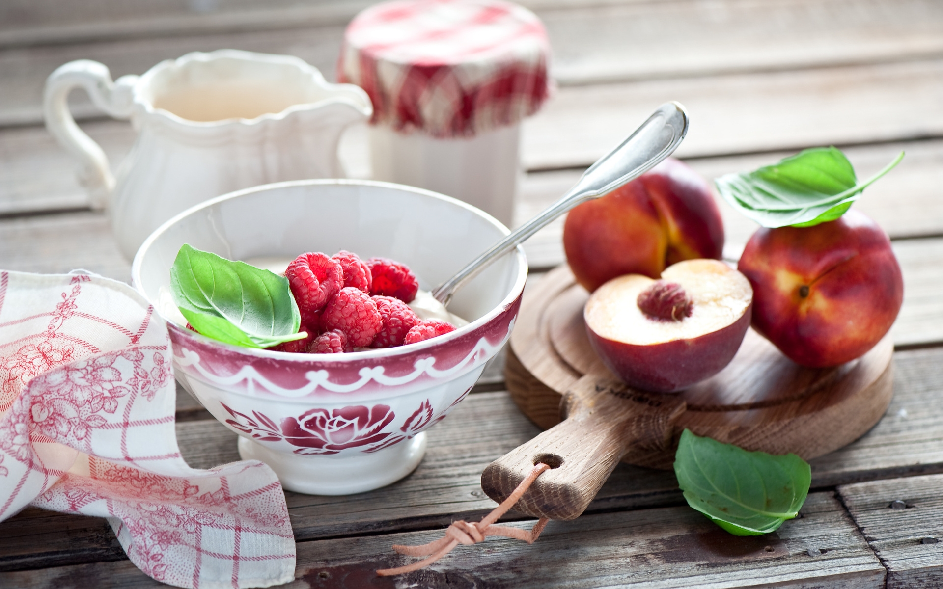 Description: A bowl of raspberries and a cup of tea on a wooden table with a tea towel and a tea bag.