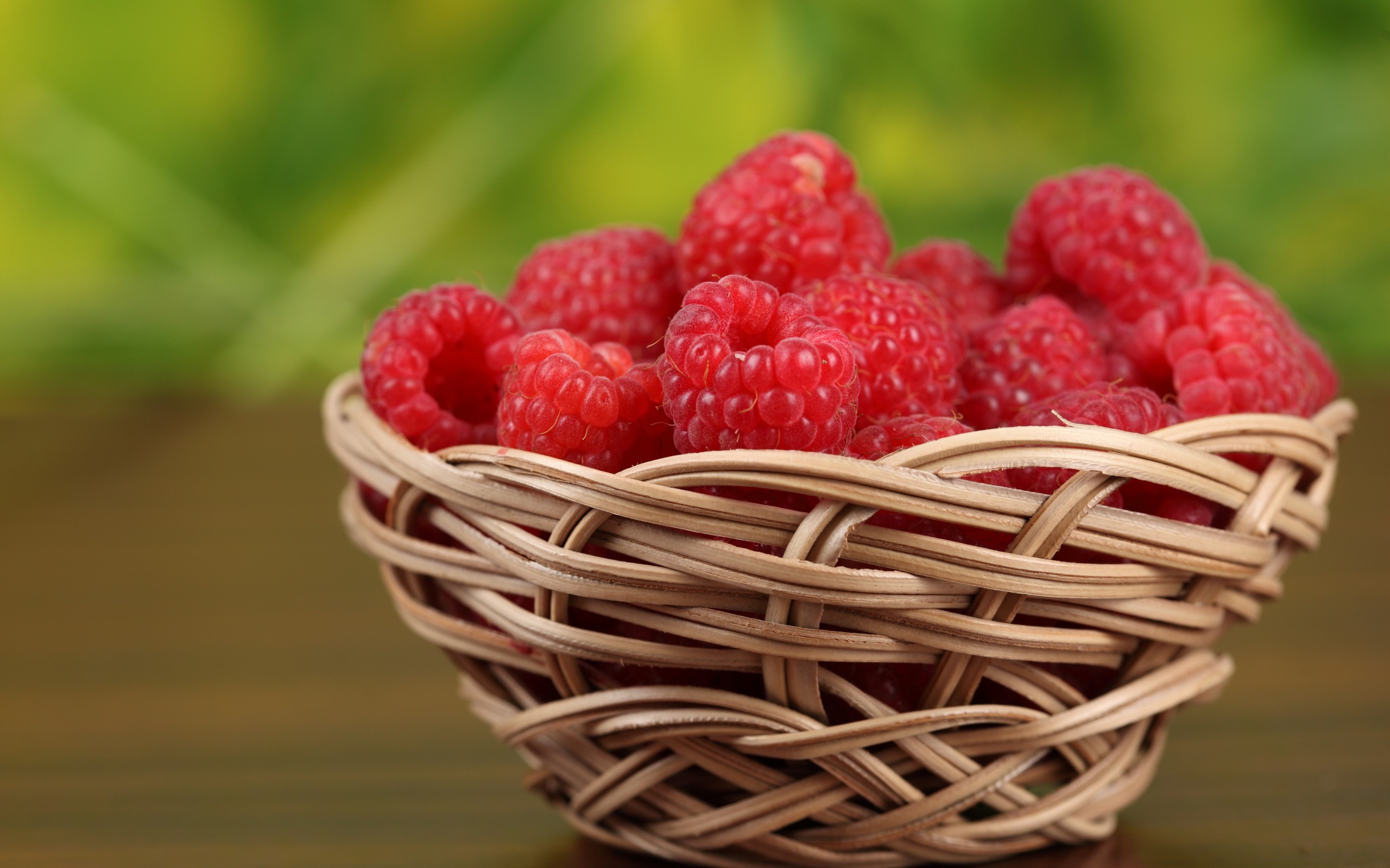 Description: A basket of raspberries on a table with a green background and a blurry image of raspberries in the background.