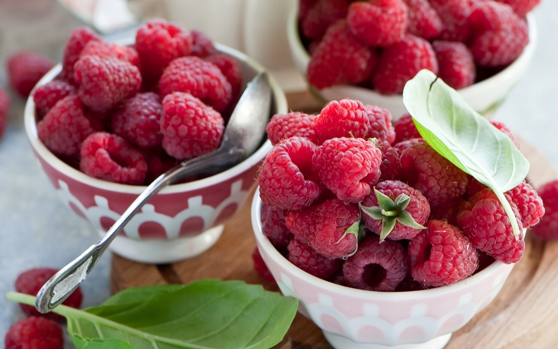 Description: A couple of bowls filled with raspberries on top of a wooden table with leaves and spoons.