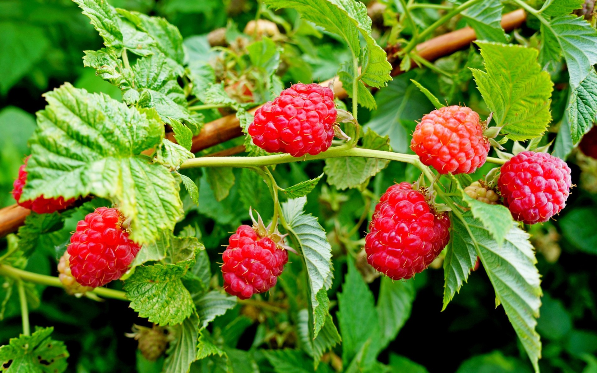 Description: A bush with raspberries growing on it and green leaves around it.