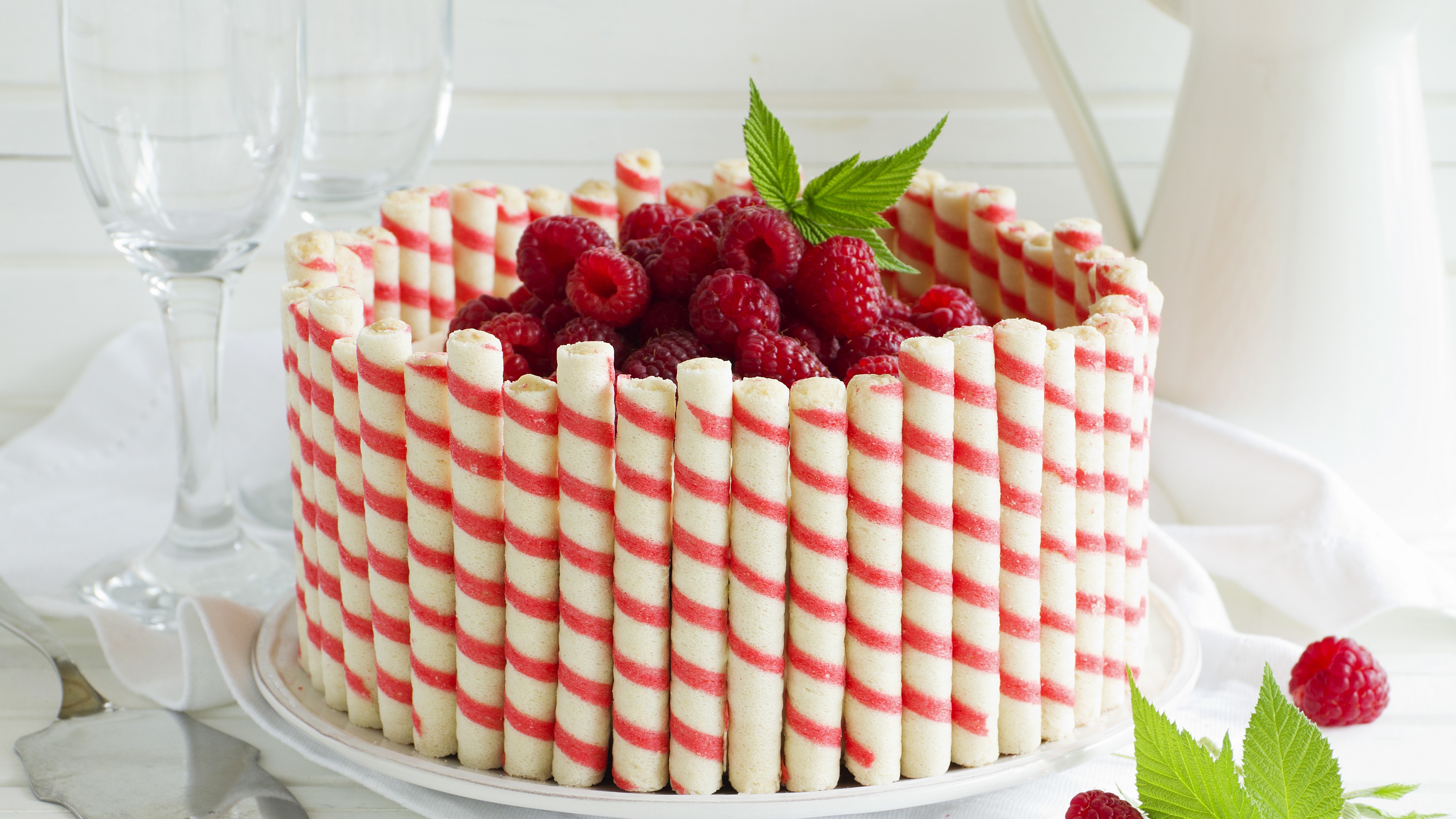 Description: A cake with raspberries and cream on a plate with a glass of water and a vase in the background.
