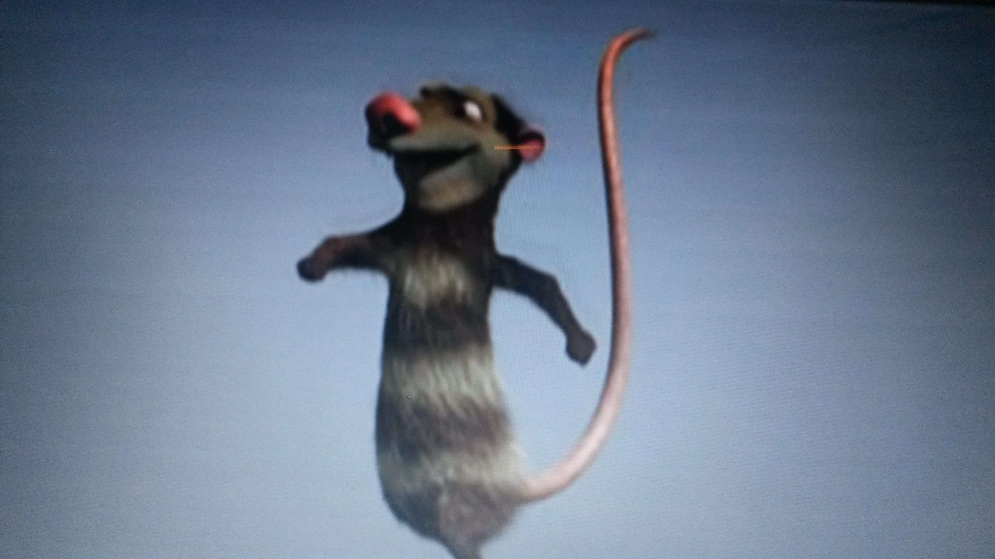 Description: A rat is jumping in the air with a long tail and a red nose and tail.