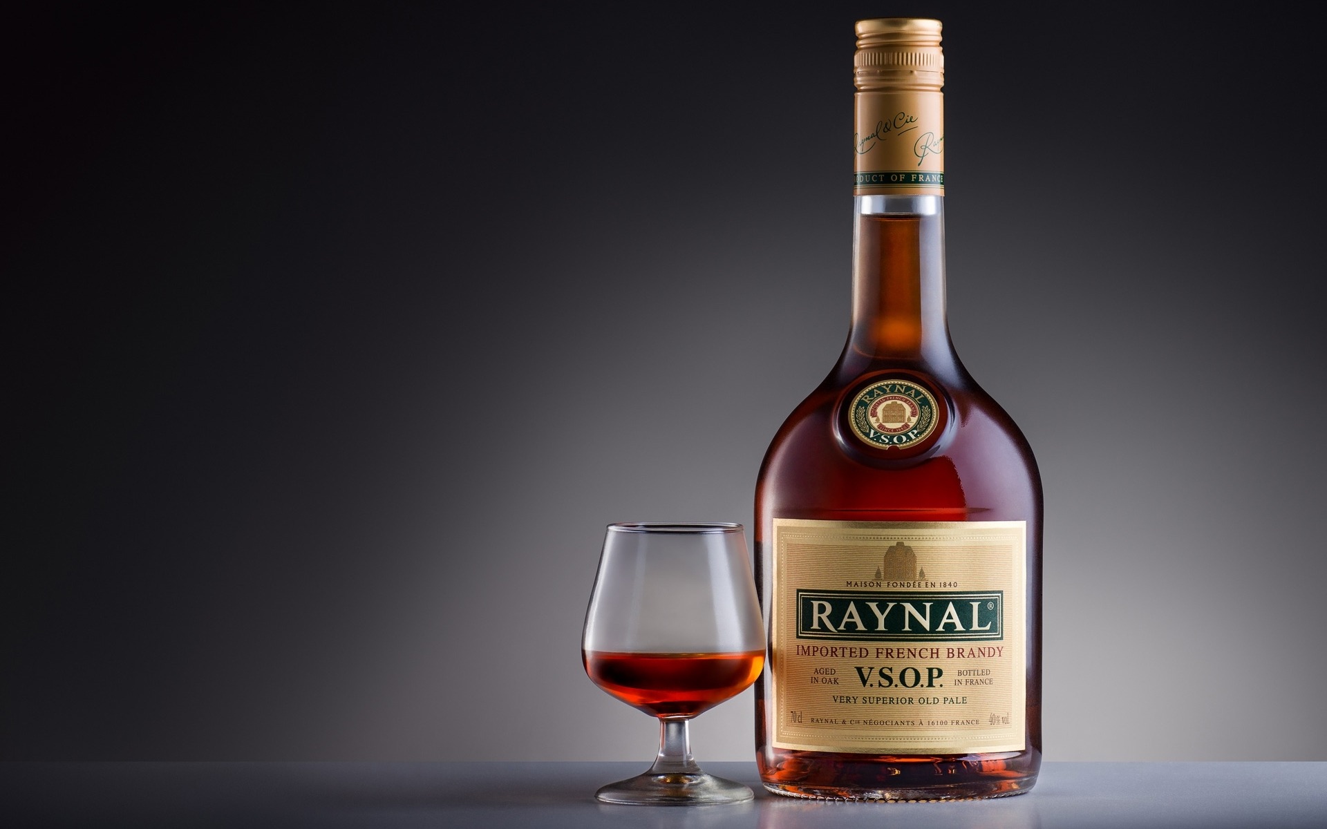 Description: A bottle of raynal wine next to a glass of wine on a table with a dark background and a gray background.
