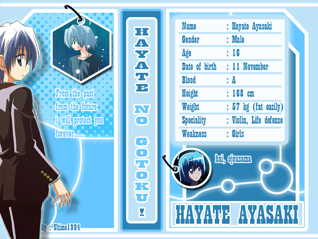 Description: A blue - haired anime character is standing in front of a blue background with information about him and his name.