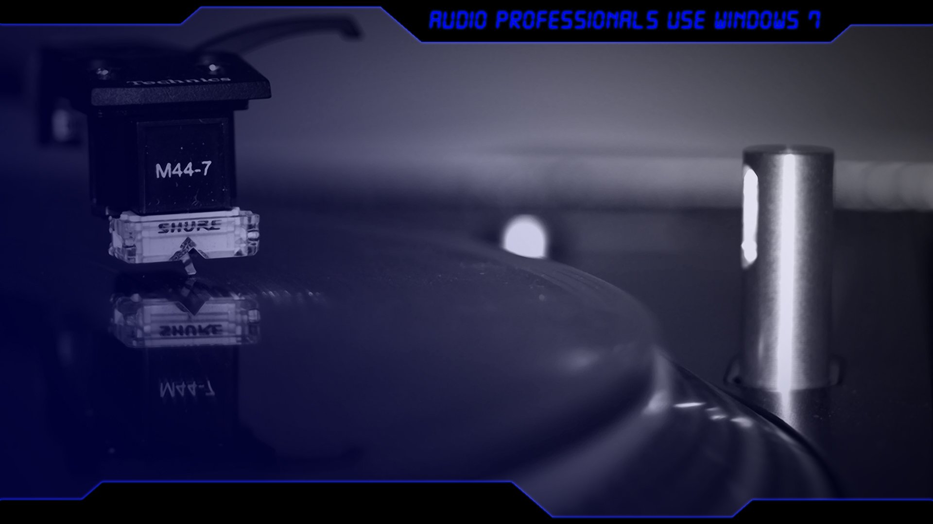 Description: A record player with a microphone and a microphone stand in front of it with the words radio professionals use windows.