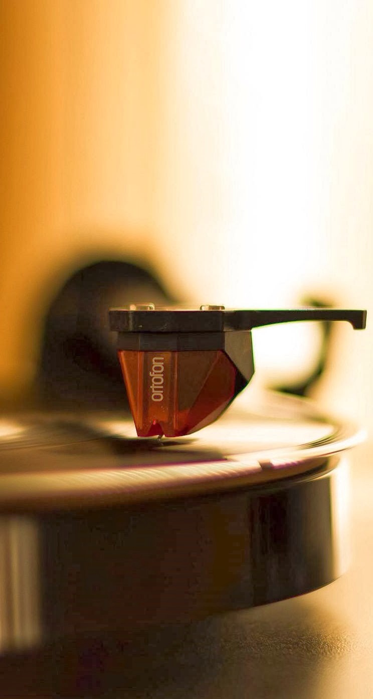 Description: A close up of a record player on a table with a blurry background of a wall and a chair.