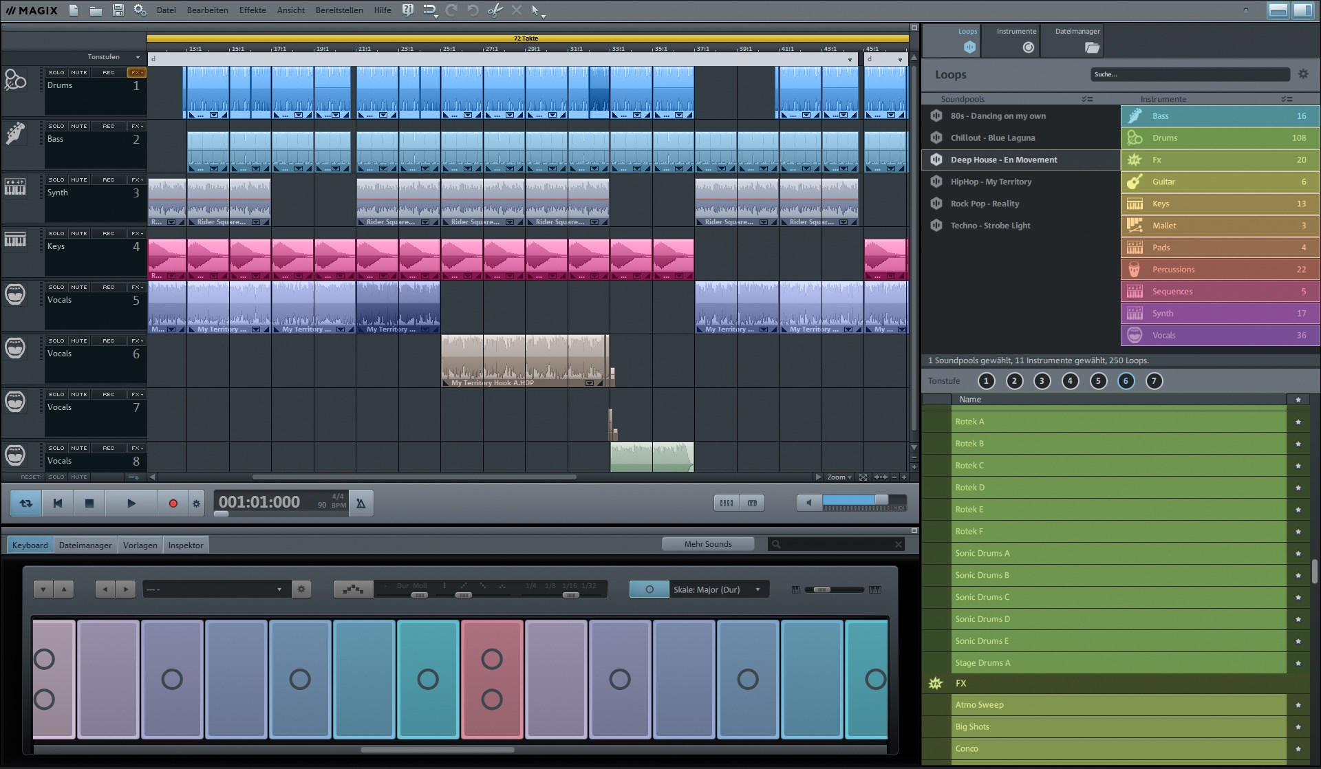 Description: A recording software with multiple audio tracks and a sound board in the background with a sound board in the foreground.