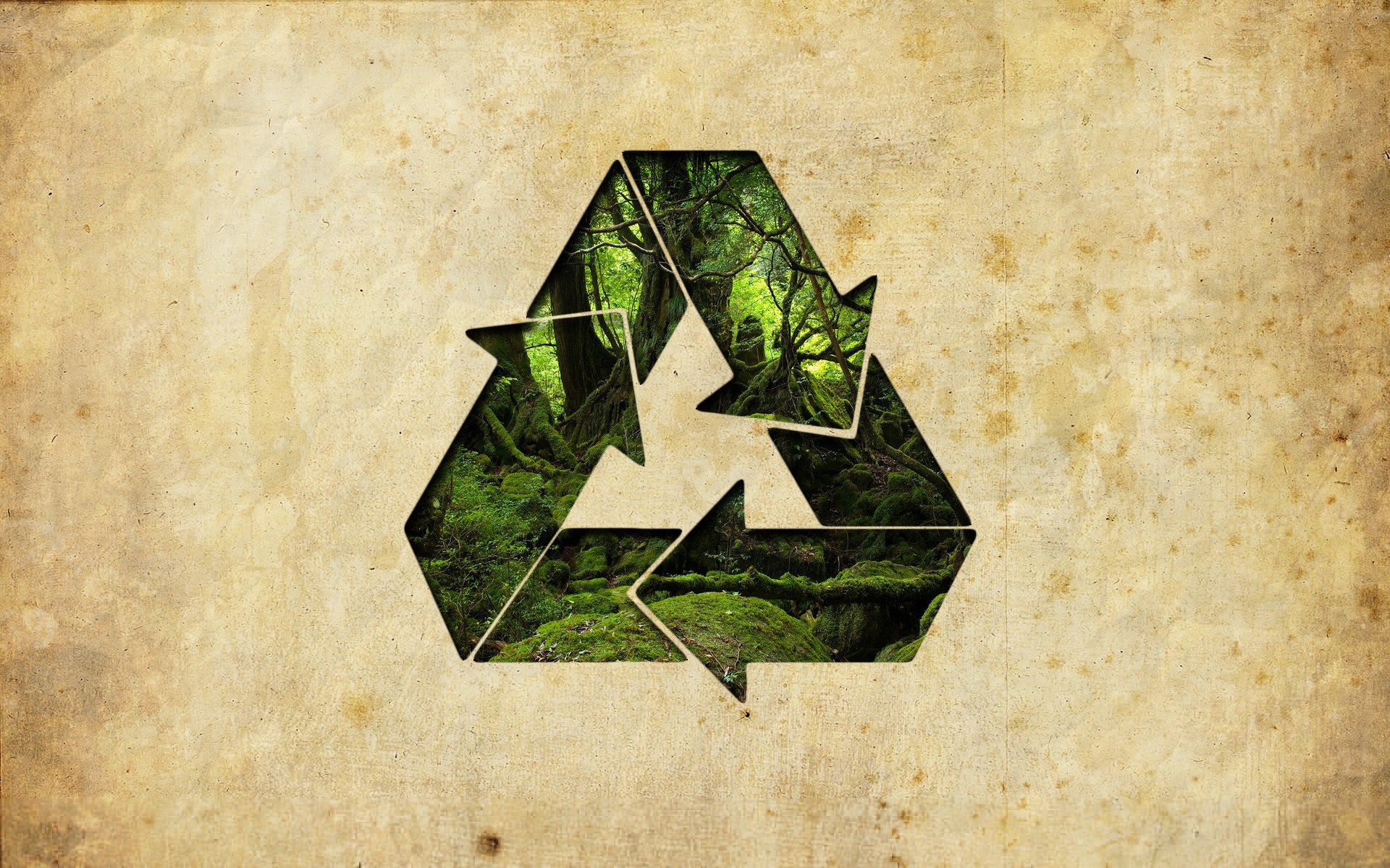 Description: A recycleable recyclement symbol is shown in a grungy photo with a forest background.
