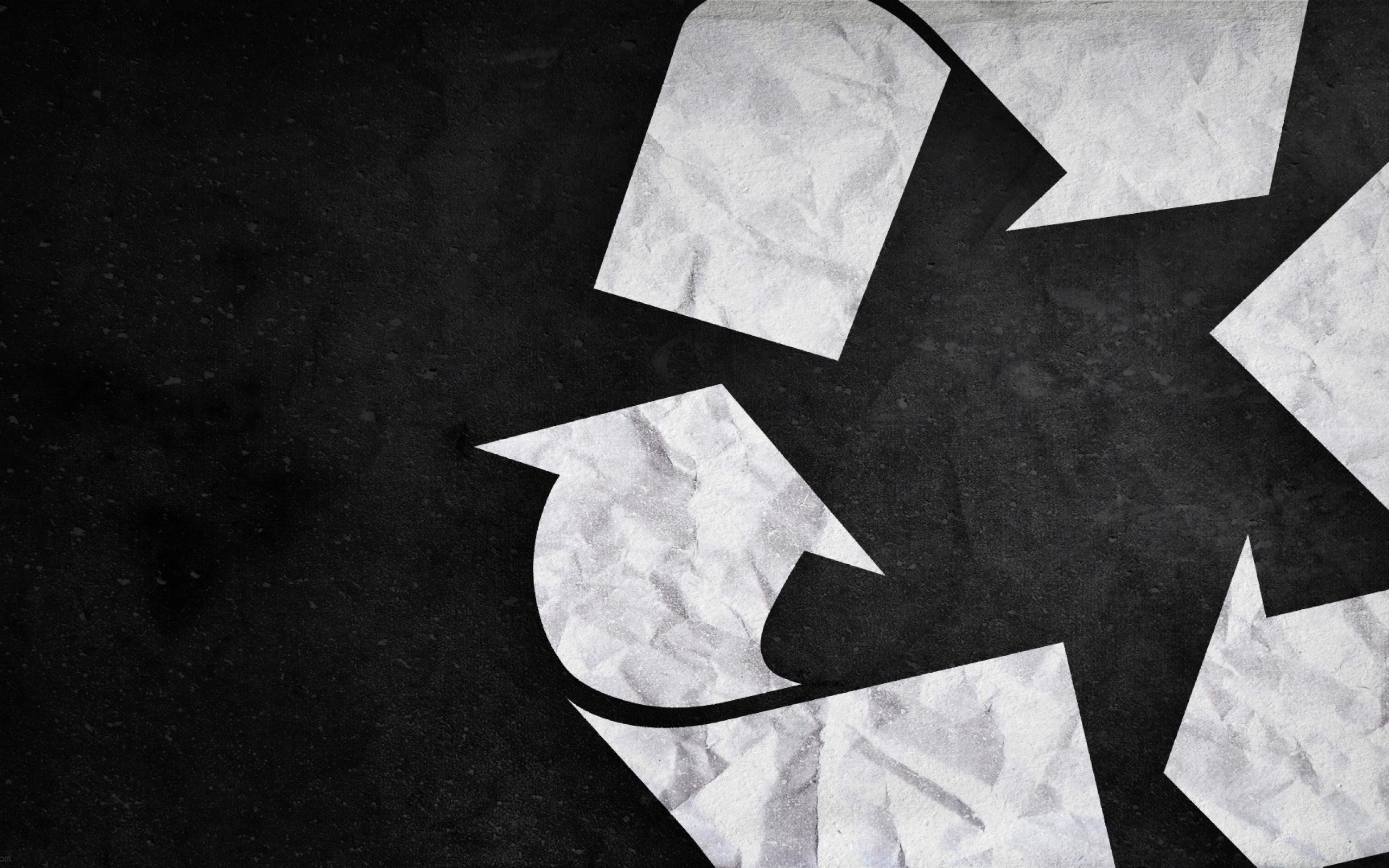 Description: A black and white photo of a recycle symbol on a piece of paper with a black background.