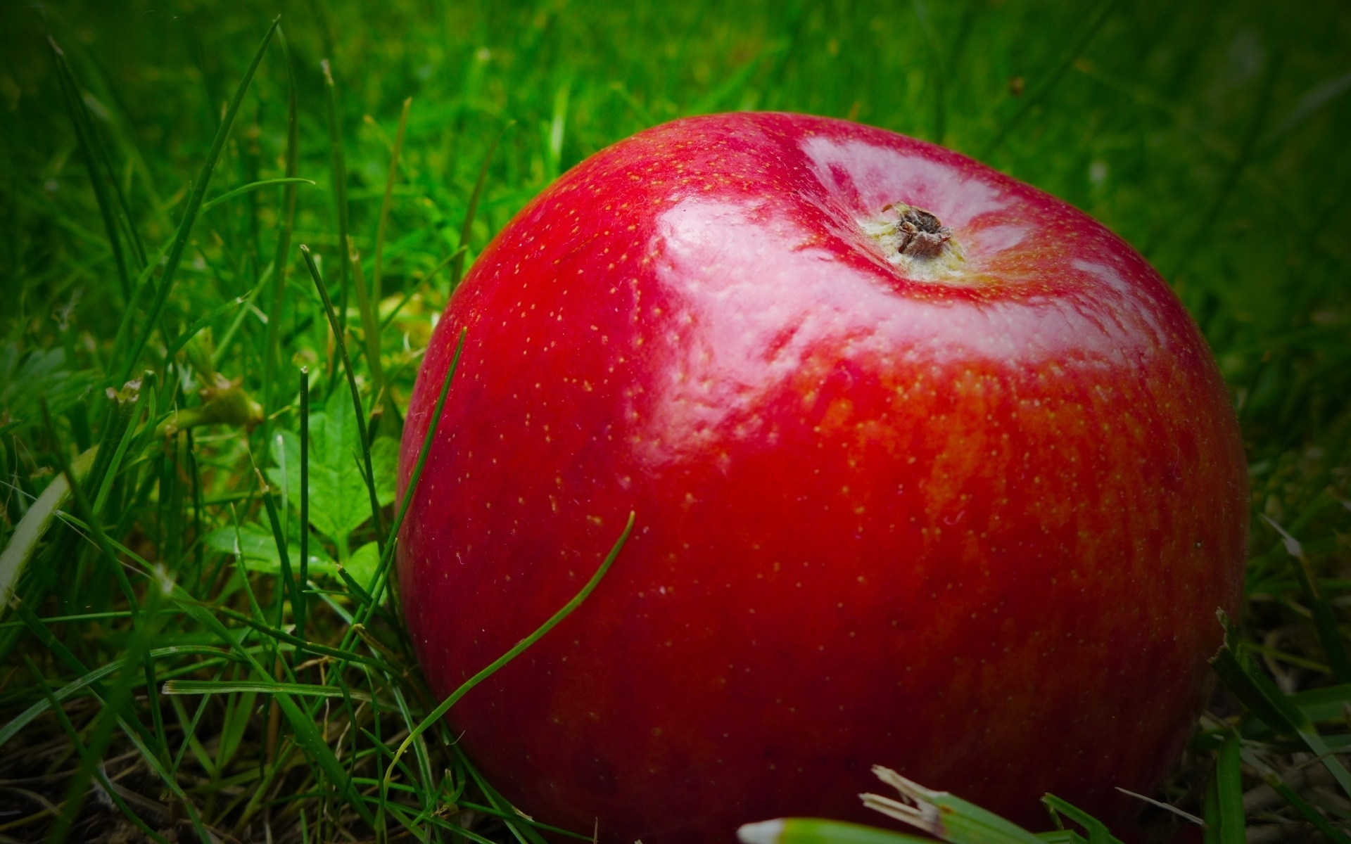 Description: A red apple sitting in the grass with a bite taken out of it's center piece and a bite taken out of it's end.