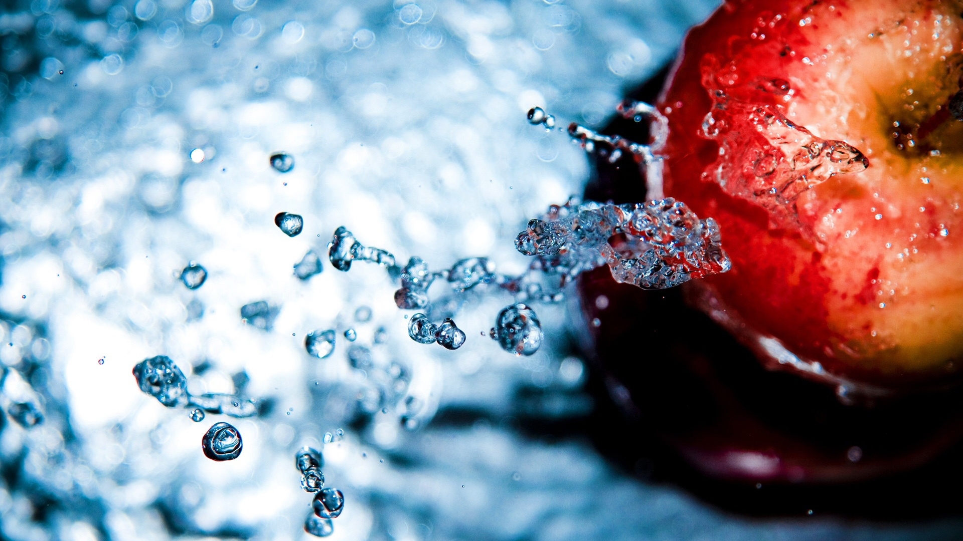 Description: A red apple with ice on it sitting in water with bubbles on it's side and a blue background.