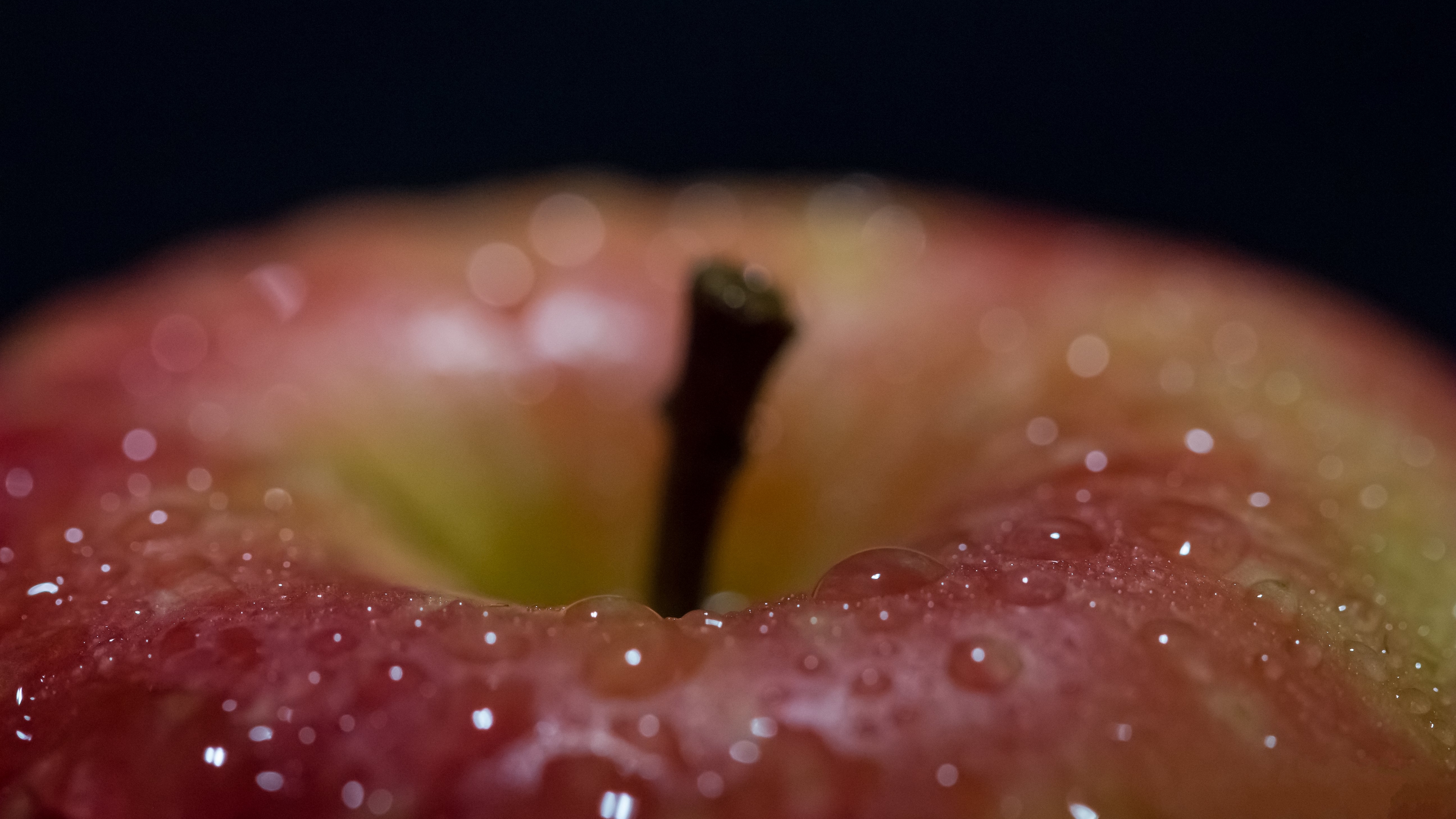 Description: A close up of a red apple with water droplets on it's surface and a black background with a black background.