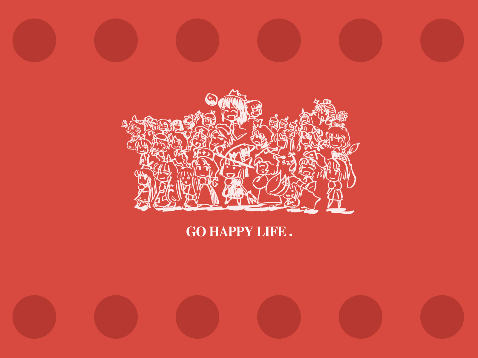 Description: A red background with a white drawing of a group of people and the words go happy life on it.